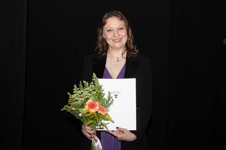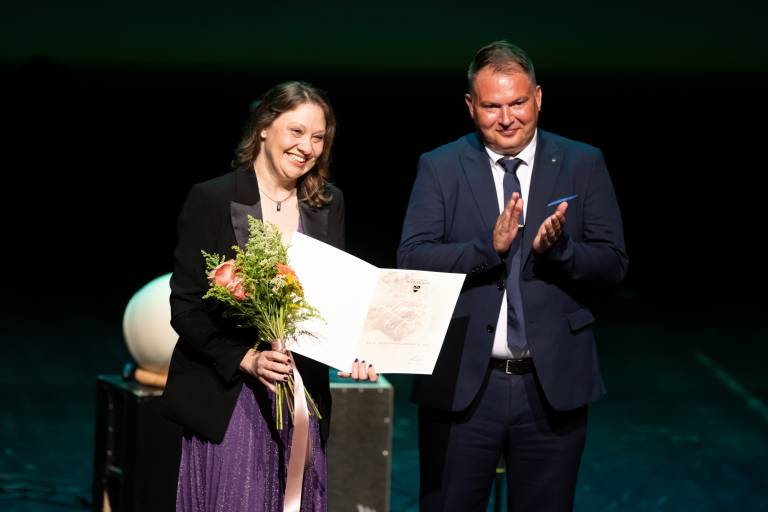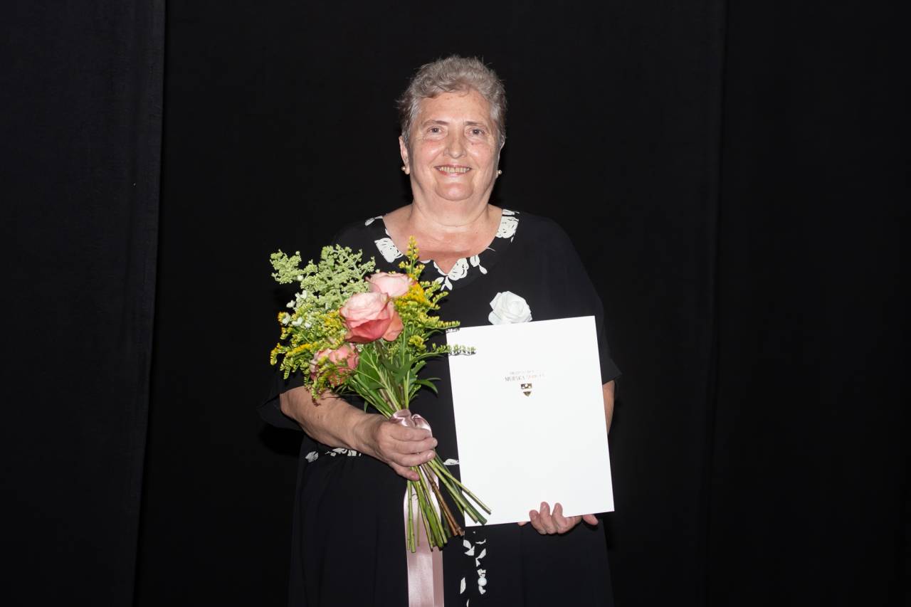 Jerneja Farkaš Lainščak prejema zahvalno listino za izjemne dosežke na področju preventive, izobraževalne in raziskovalne dejavnosti v medicini.