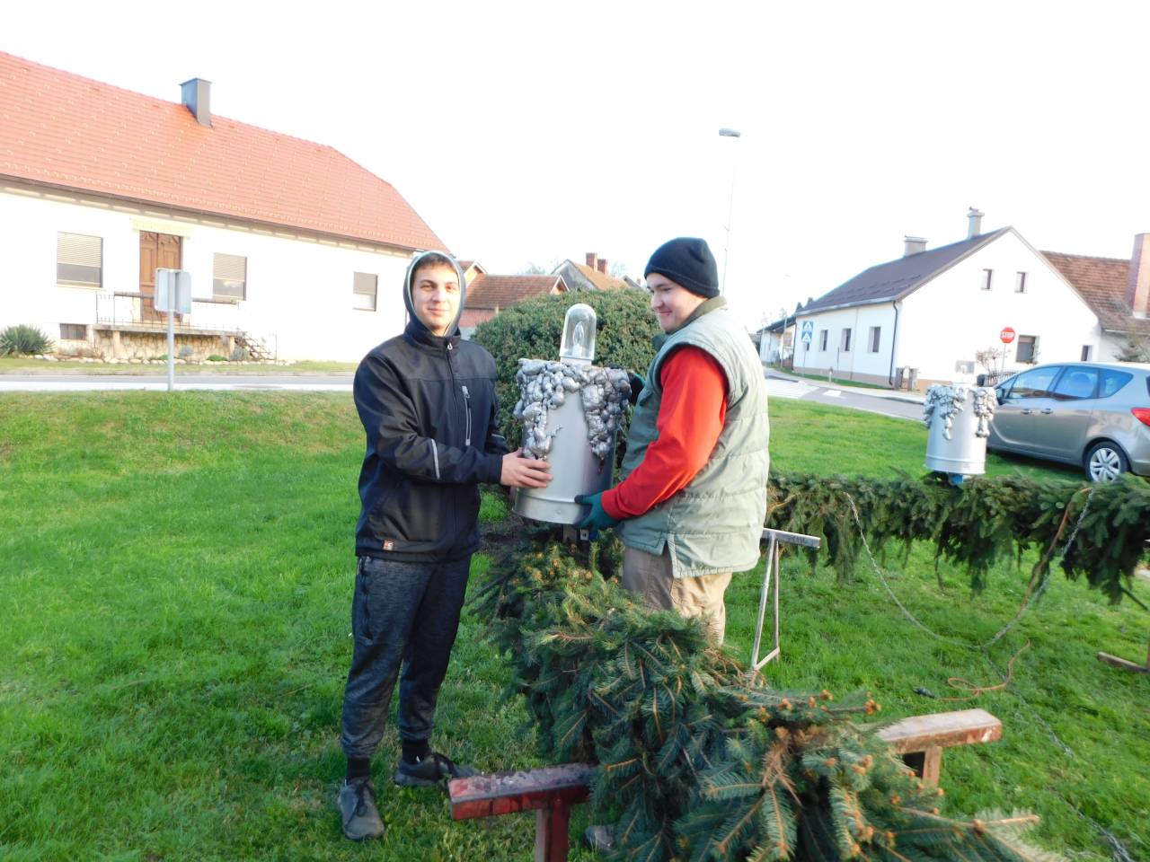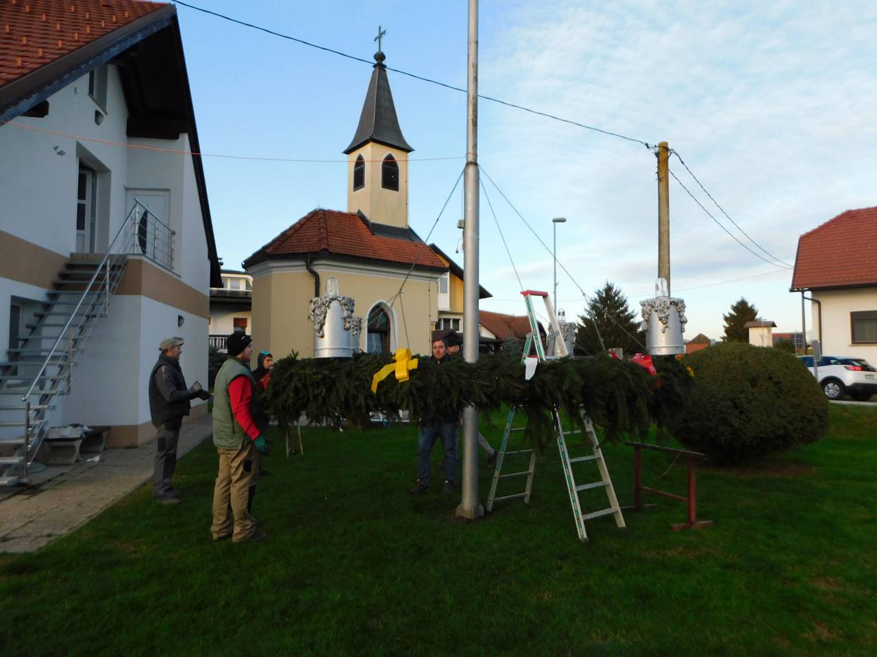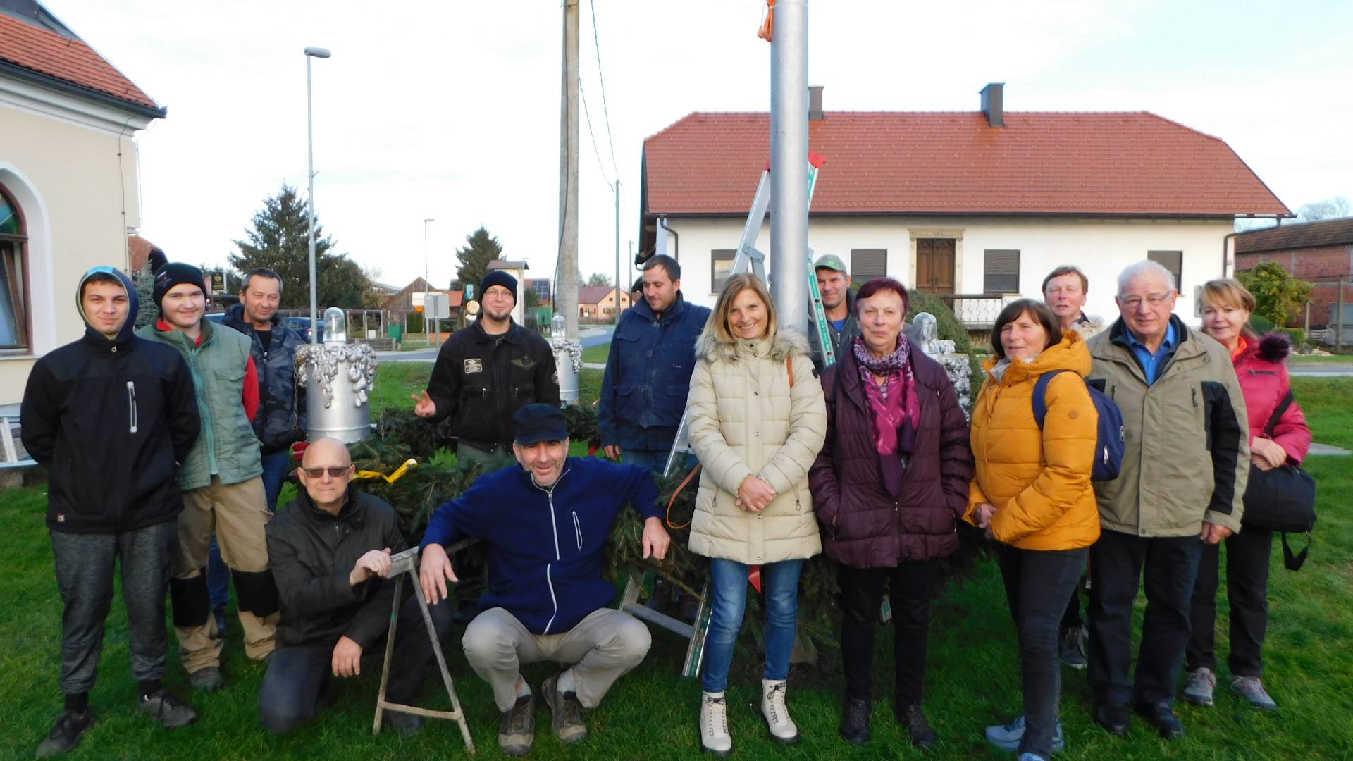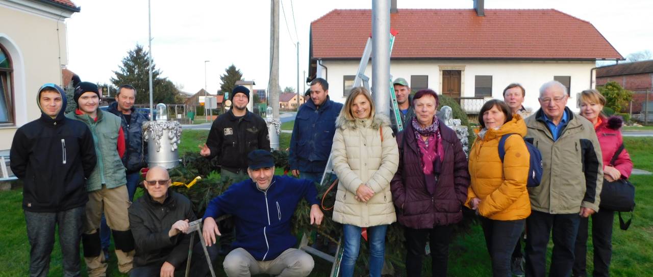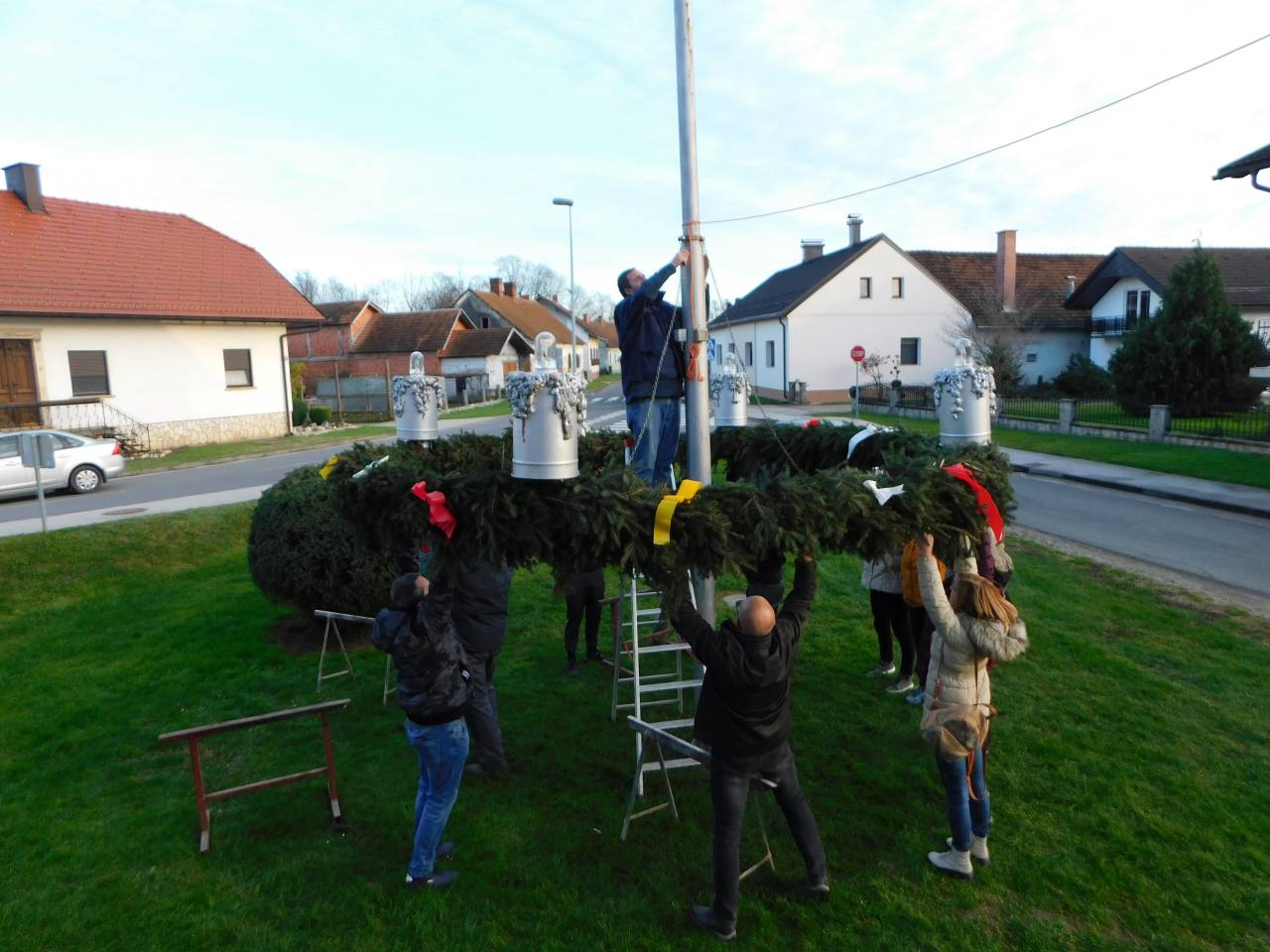 Po končanem delu so tako člani društva kot ostali vaščani stopili skupaj in adventni venec ročno dvignili na kandelaber.