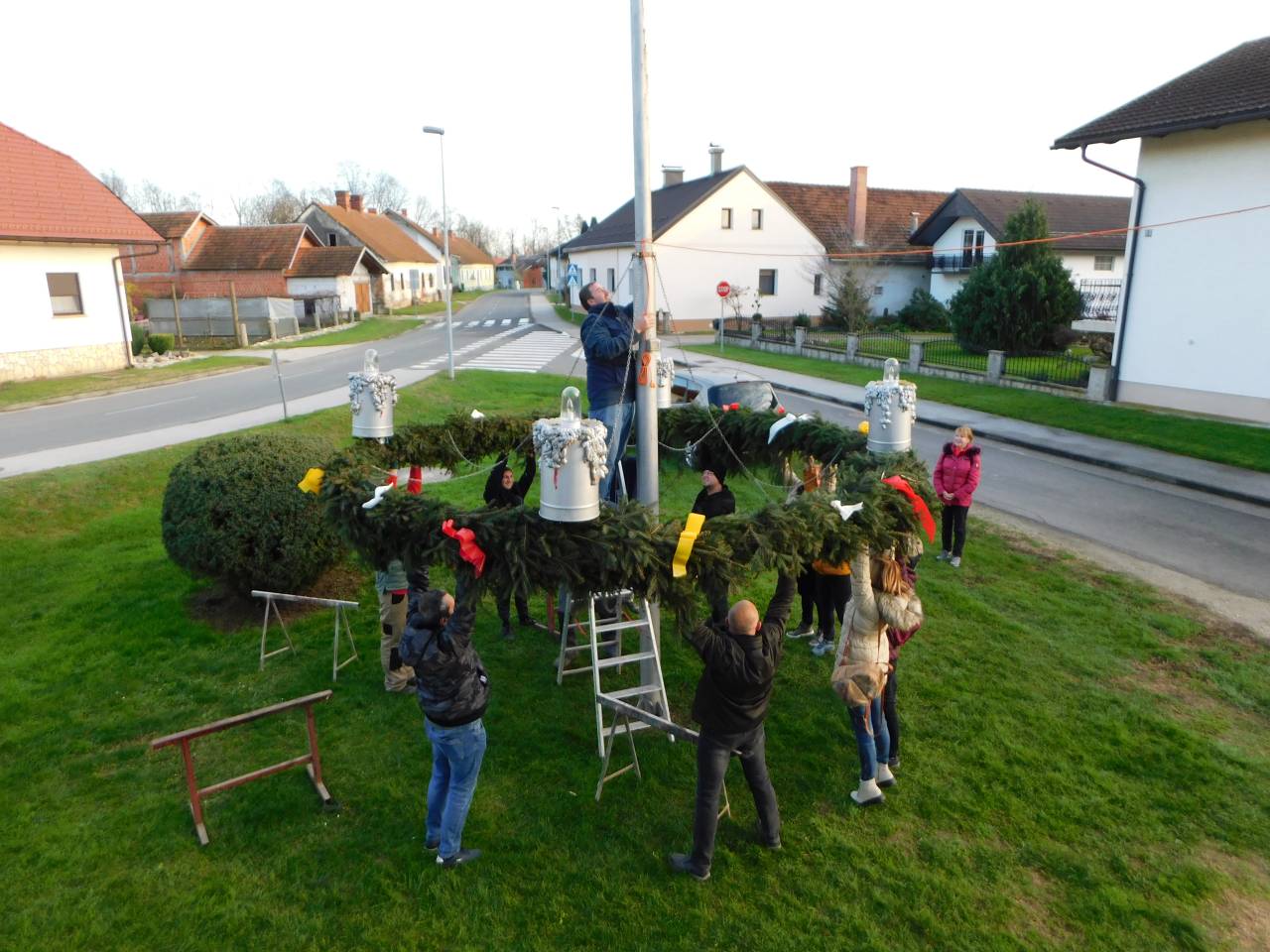 Potem, ko so venec spletli so nanj položili štiri lučke in ga okrasili z rdečimi, rumeni in belimi pentlji ter večbarvnimi različnimi drobnimi lučkami v dolžini 35 metrov, ki bodo dodatno krasili banovski adventni venec.
