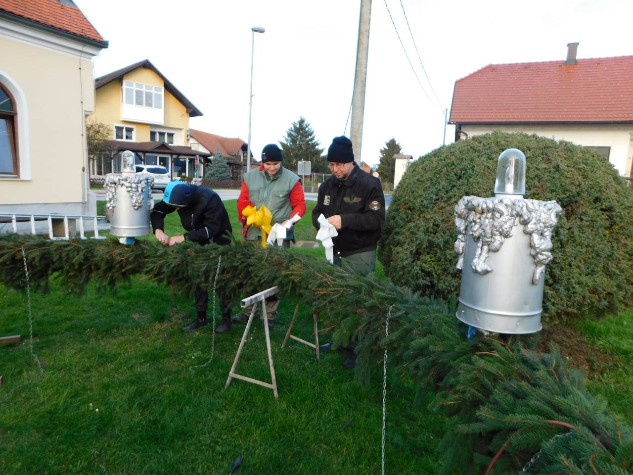 Pletenje venca jim je šlo kar lepo od rok, kajti smrečje so povezali eno k drugi in vse skupaj ovili z žico.