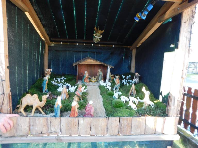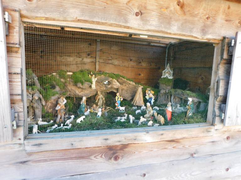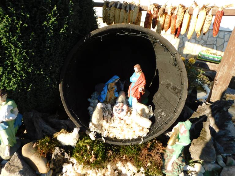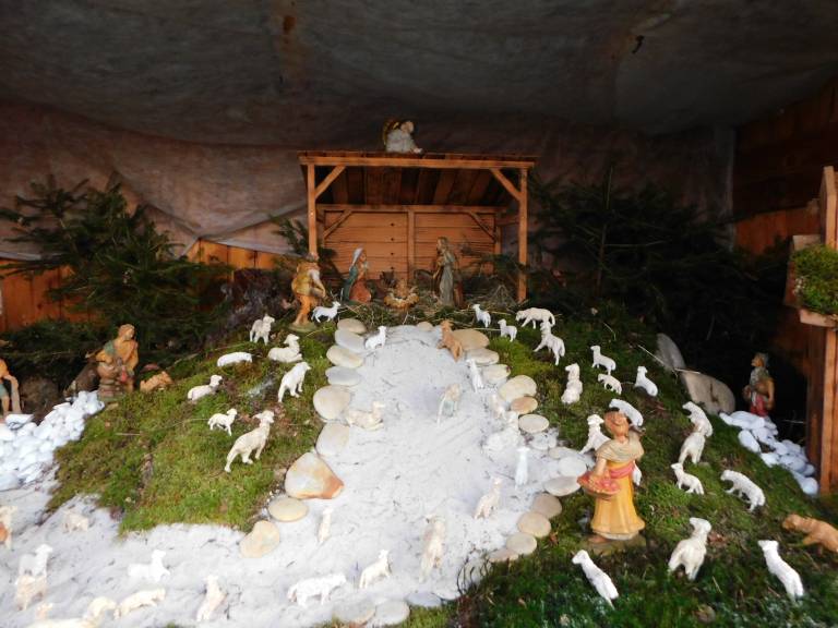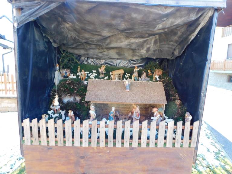 Iz gore teče izvir vode, kjer se napajajo ovčke, jaslice pa so pokrite z mahom in zelenjem, vse pa so postavljene pred domačijami.