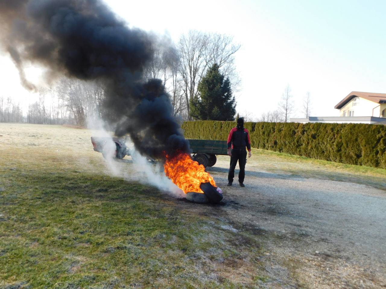 Med razlaganjem o ekologiji pa je nepridiprav na bližnjem travniku zakuril avtomobilske gume. Črni dim se je valil daleč nad Banovci in ogenj v naravi je ogrožal bližnje stanovanjsko naselje term in bližnje stanovanjske hiše v vasi Banovci.