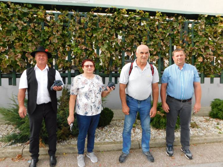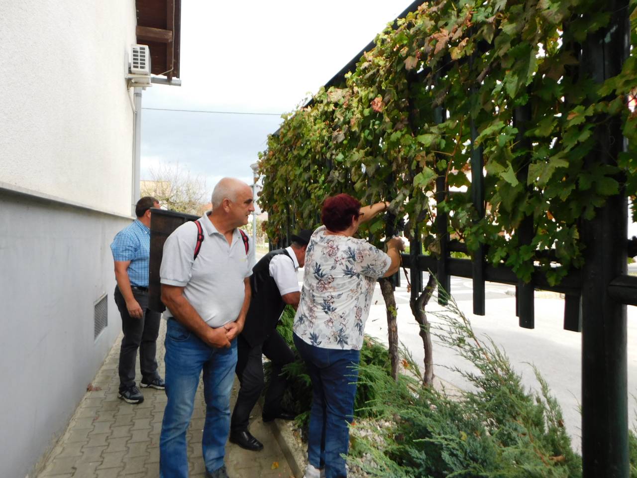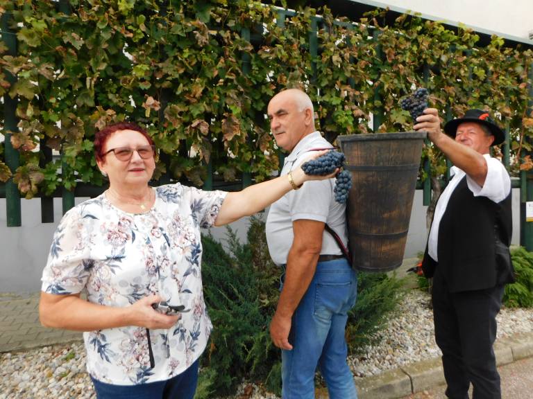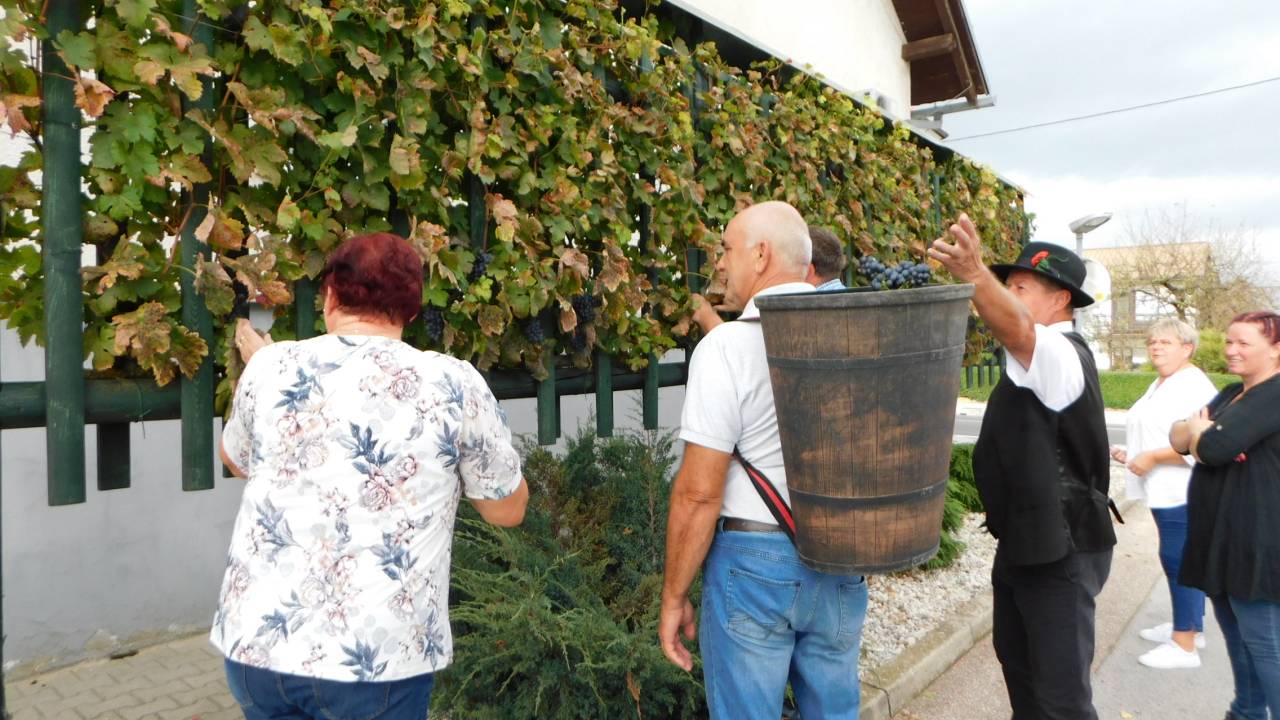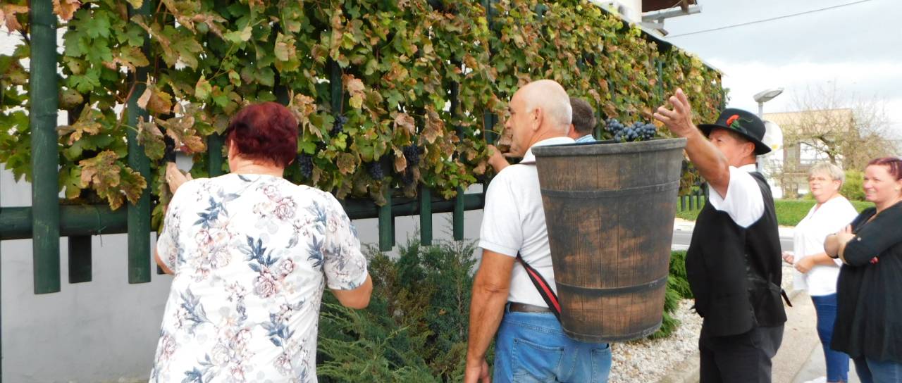 V Turnišču se je včeraj, 8. oktobra, odvijala trgatev grozdja žametne črnine, ki raste pred občinsko zgradbo.