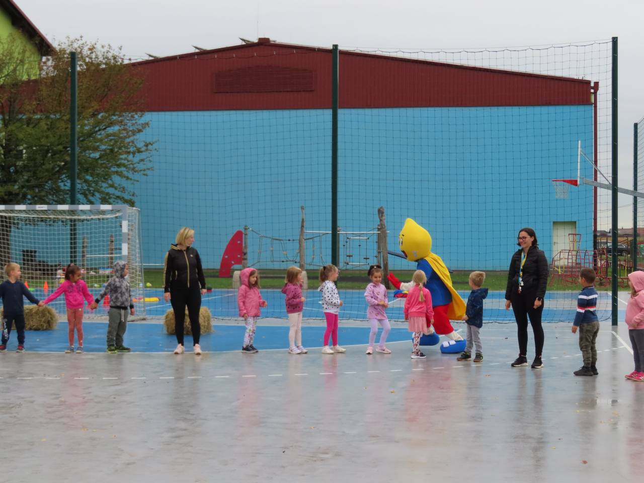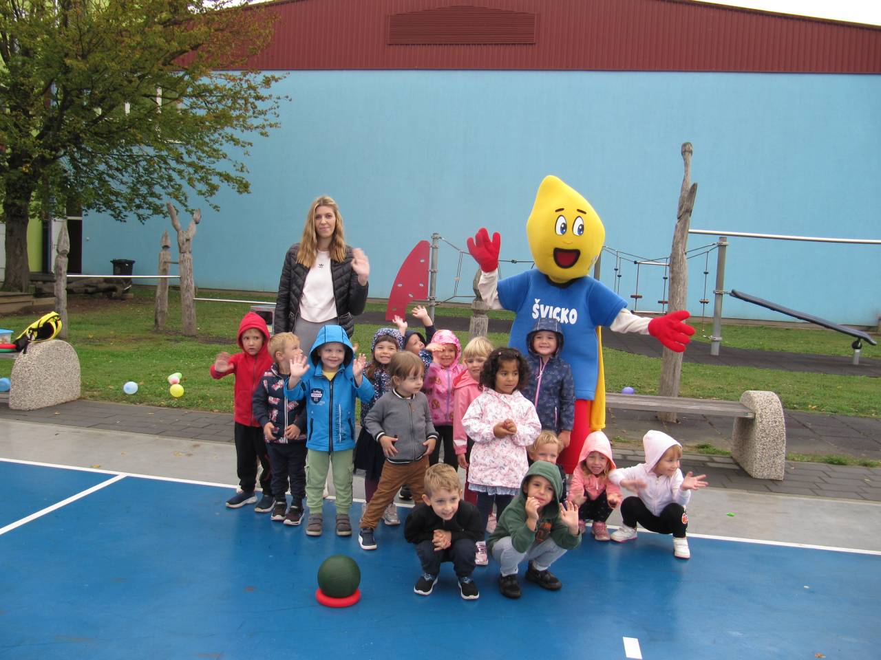 Najprej so se zbrali na igrišču, kjer jih je obiskala maskota Namiznoteniškega kluba Murska Sobota - Švicko.