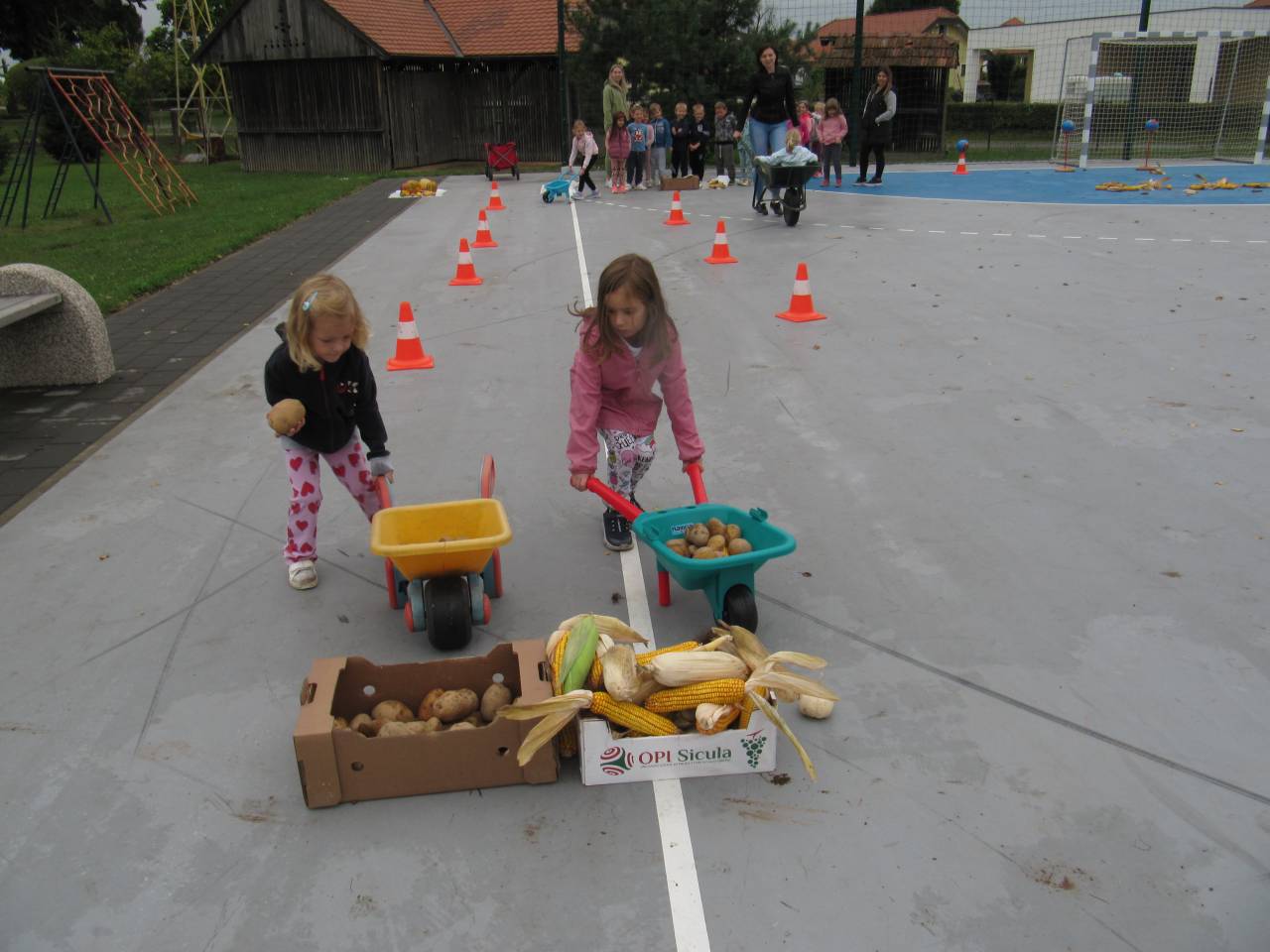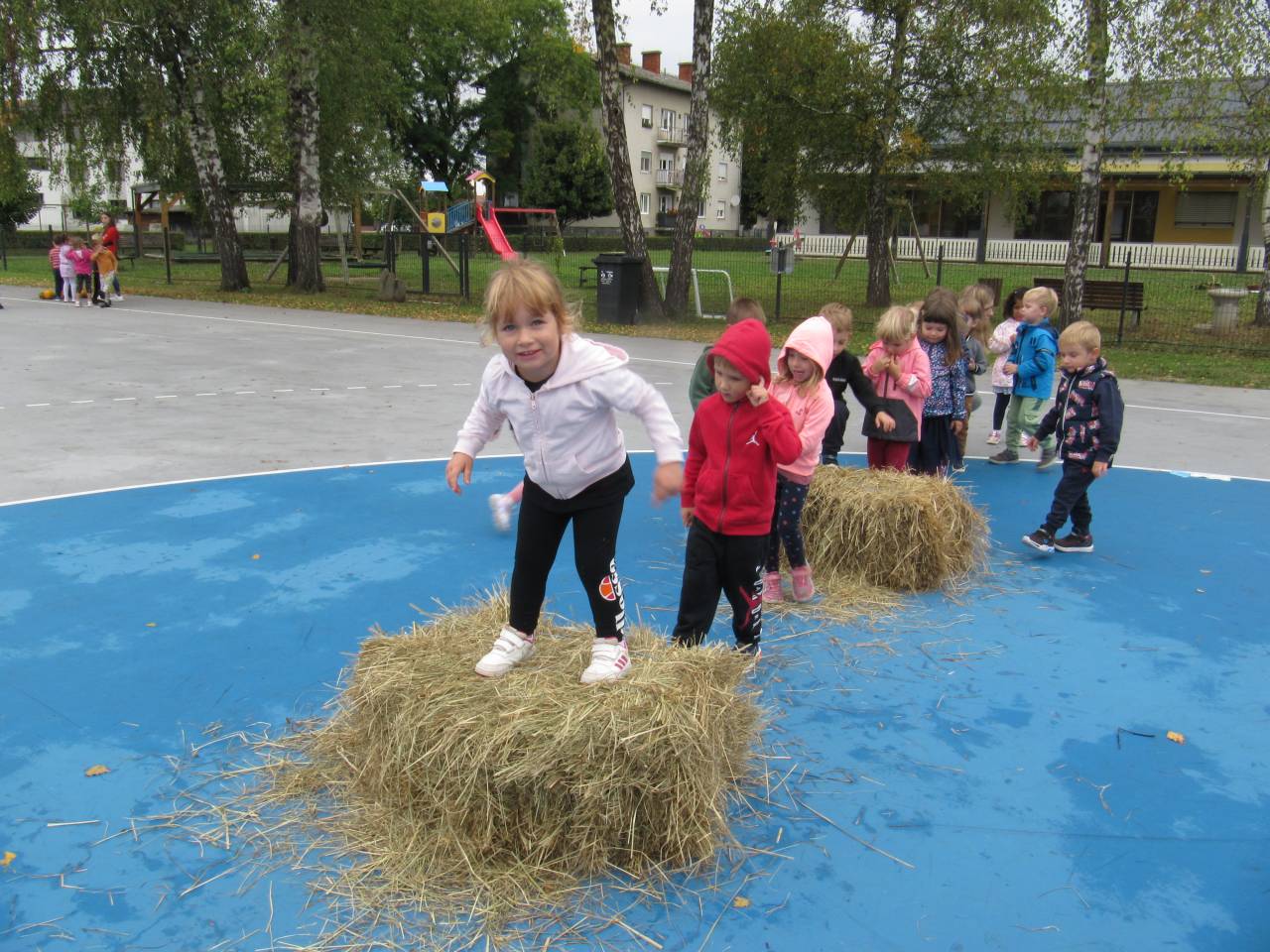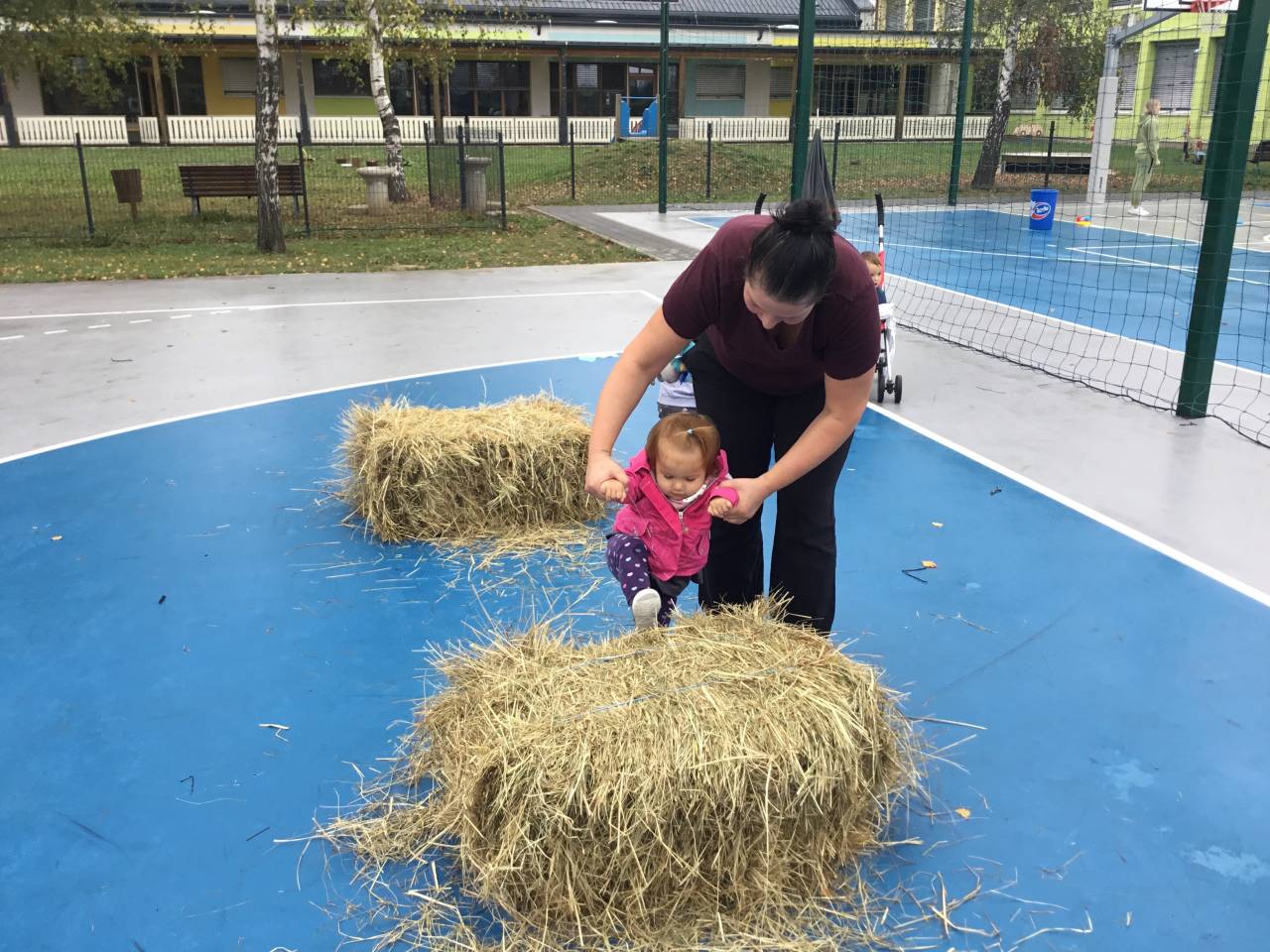Da pa so zares pozdravili jesen, so vzgojiteljice pripravile še nekaj poligonov, kjer so otroci preizkušali svoje spretnosti v kotaljenju buč, podiranju tarč s koruzo, v vožnji samokolnice z jesenskimi pridelki, plezanju in hoji po balah sena.