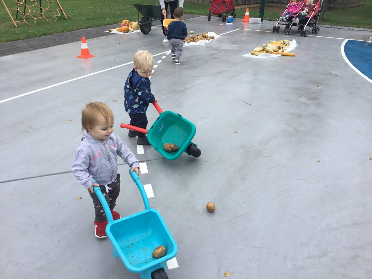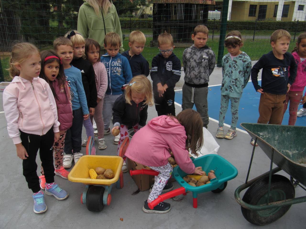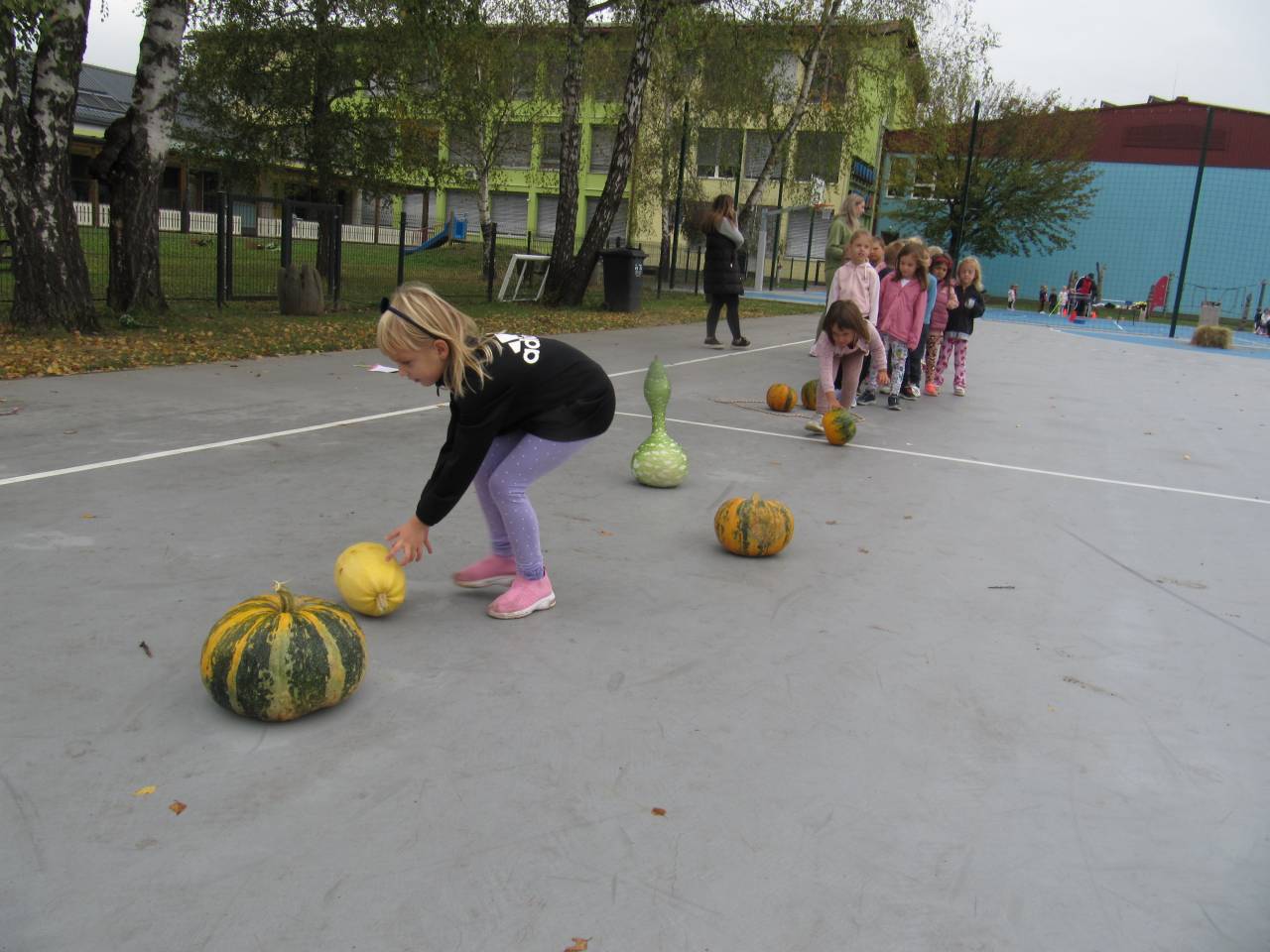 Da pa so zares pozdravili jesen, so vzgojiteljice pripravile še nekaj poligonov, kjer so otroci preizkušali svoje spretnosti v kotaljenju buč, podiranju tarč s koruzo, v vožnji samokolnice z jesenskimi pridelki, plezanju in hoji po balah sena.