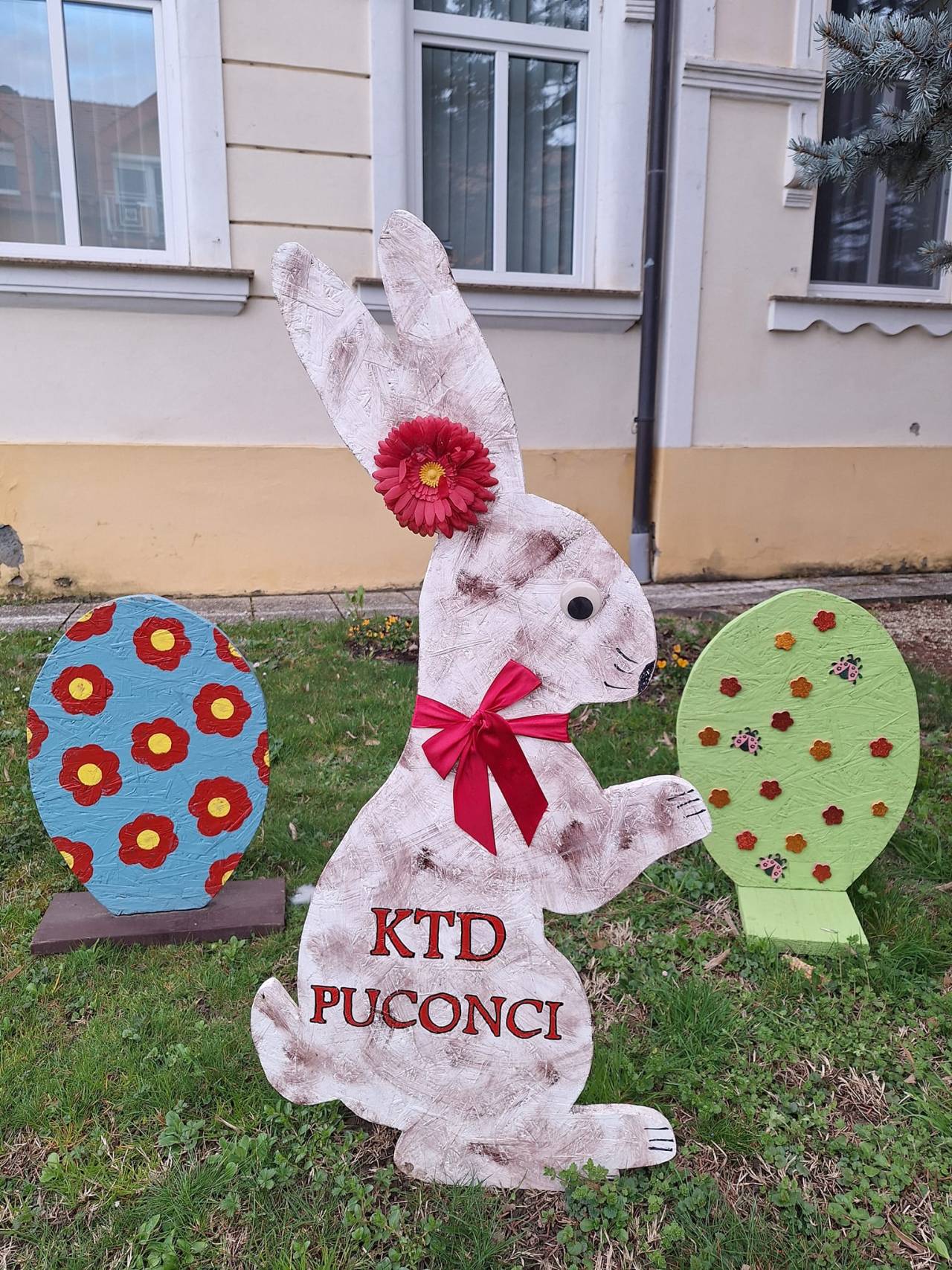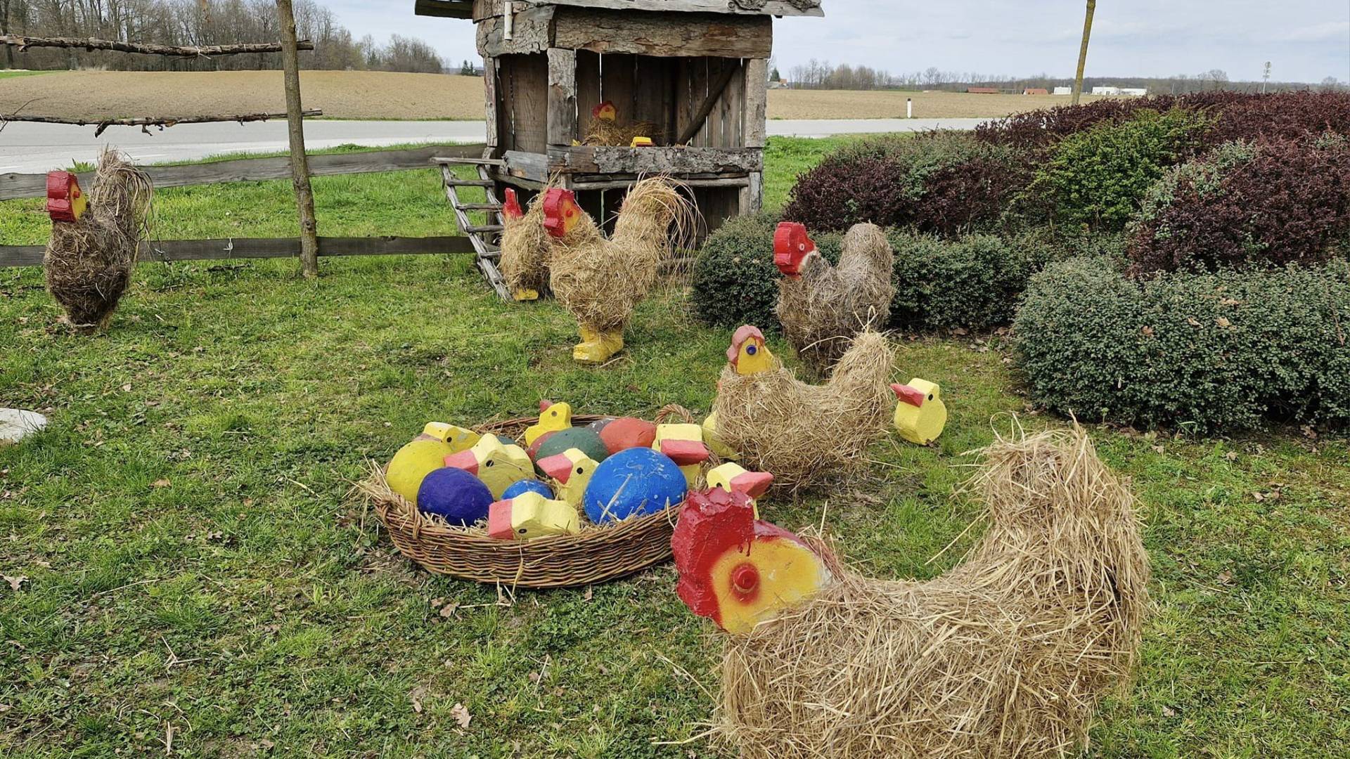 V naselju Vadarci v občini Puconci so na ogled postavili lesene velikonočne zajčke s pentljami, cvetličnike, slamnate kokoši in ogromno jajce narejeno iz vej.