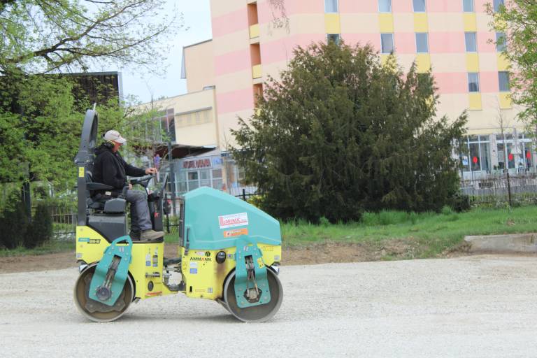 Na lokaciji so vidni gradbeni stroji, med njimi bager in valjar, ki izvajata izravnavo terena in utrjevanje podlage. Del površine je že na novo nasut z gramozom.