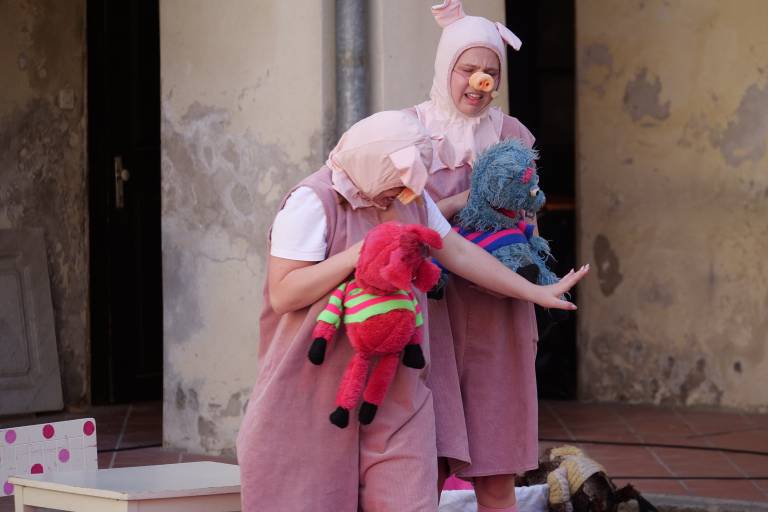 Mladi igralki Noemi Čop in Tajda Podvratnik sta s pomočjo igrač uprizorili priljubljeno pravljico o treh prašičkih. Predstava je vključevala aktivno sodelovanje otrok, ki so pomagali plašnim prašičkom premagati strah pred ljudmi.