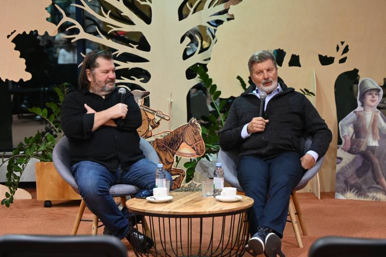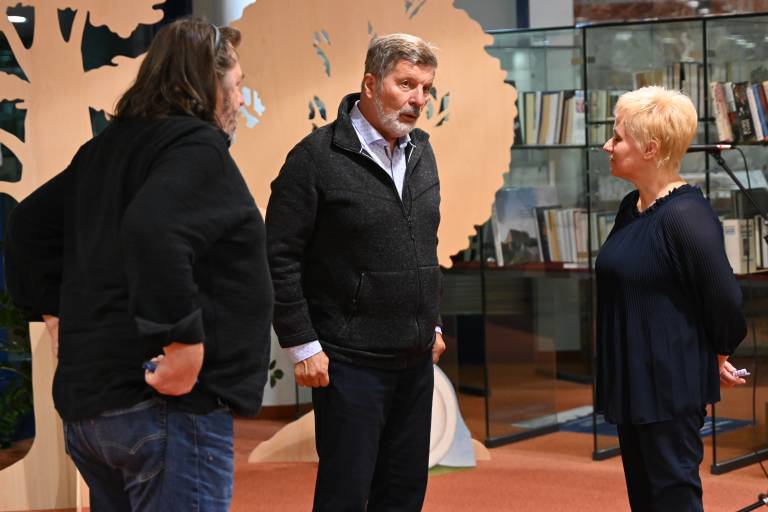 V avli Pokrajinske in študijske knjižnice Murska Sobota je danes bil posebej prijeten in toplo obarvan dogodek – Klepet ob kavi s sinom legendarnega Mikija Mustra Miklavžem Mustrom in njegovim dolgoletnim založnikom Aleksandrom Buhom.