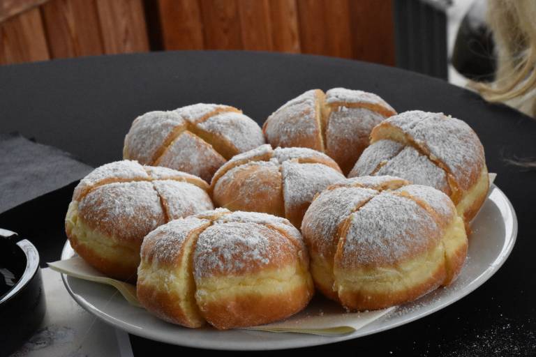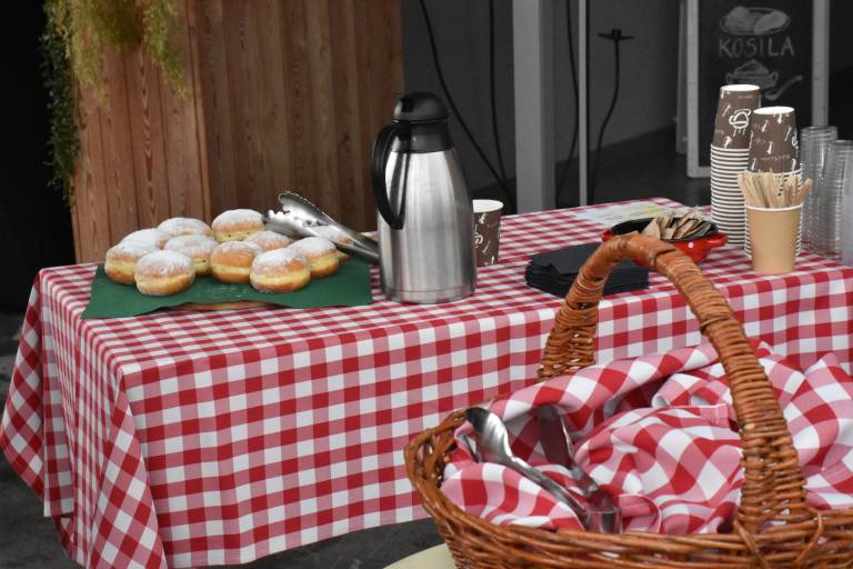 Na terasi so se obiskovalci lahko okrepčali tudi s pustnimi krofi in se fotografirali s kurenti.