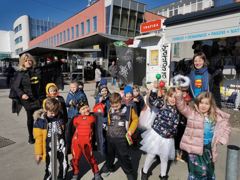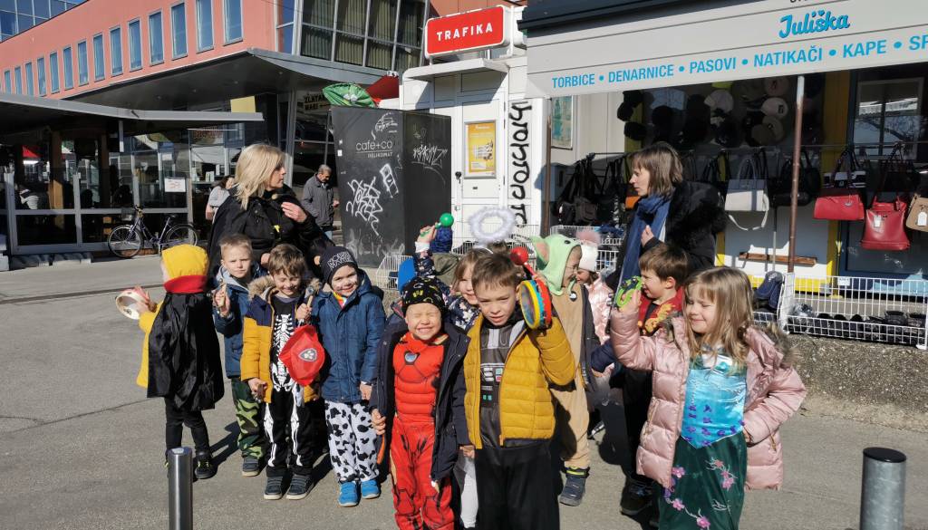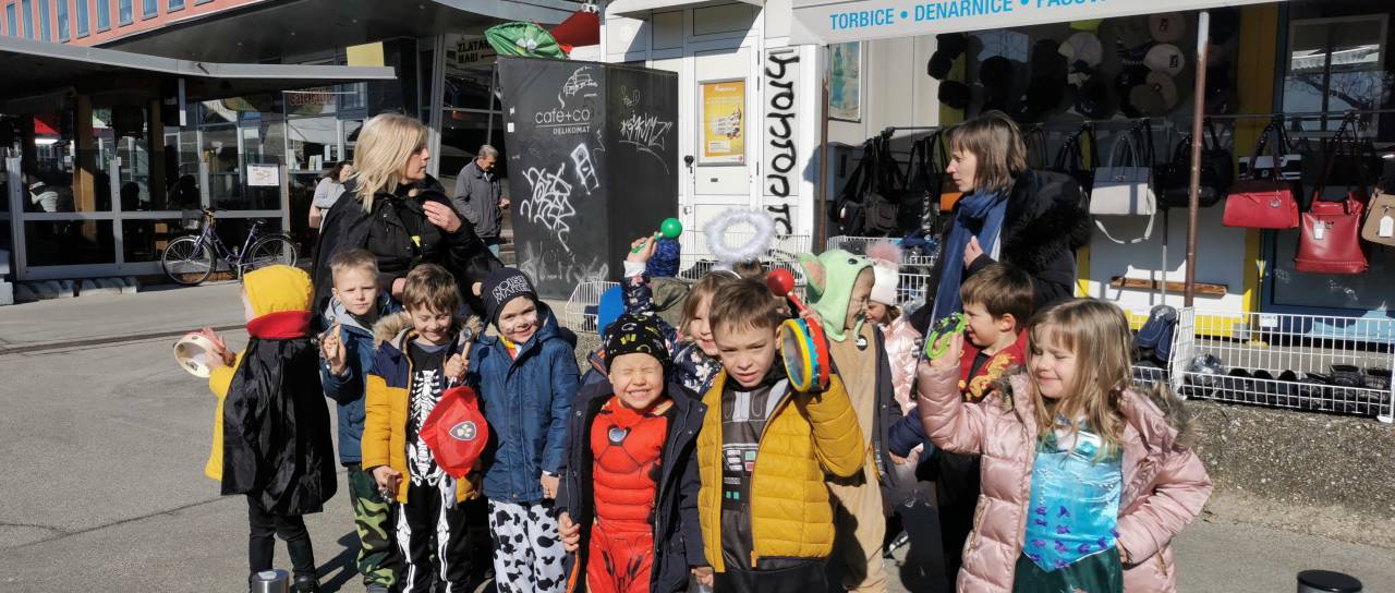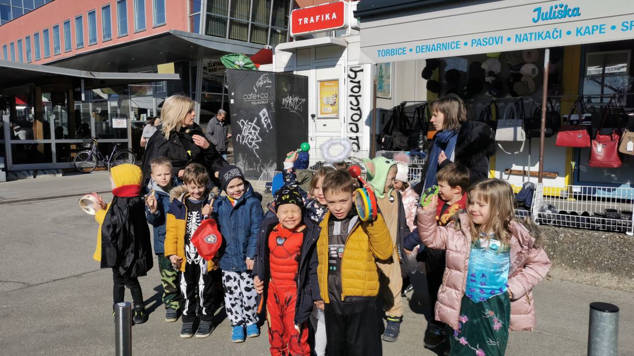 Otroci iz Vrtca Murska Sobota, enota Urška, so se skupaj z vzgojiteljicama po ulicah sprehodili našemljeni v pustne maske, pri tem pa žvižgali in rajali na vso moč.