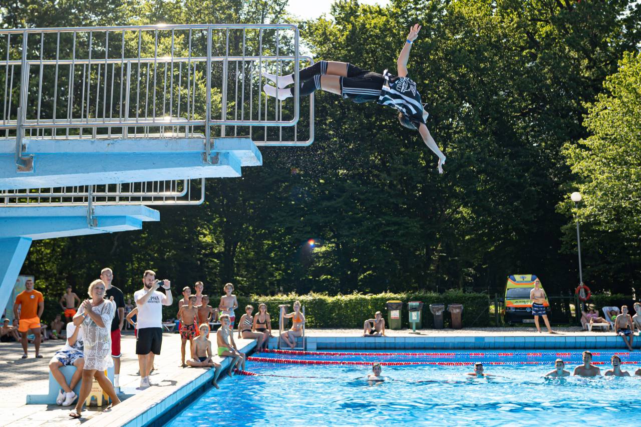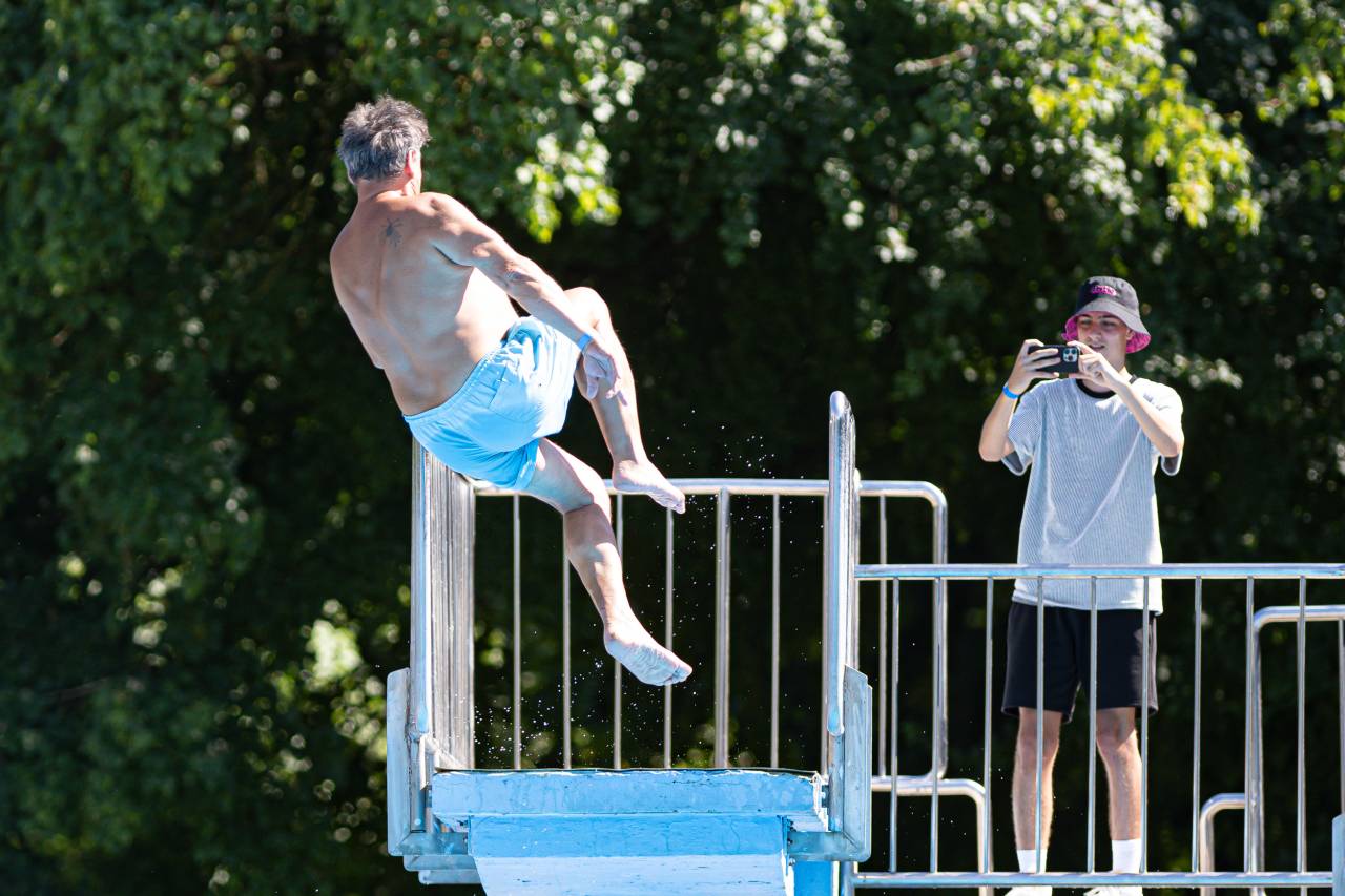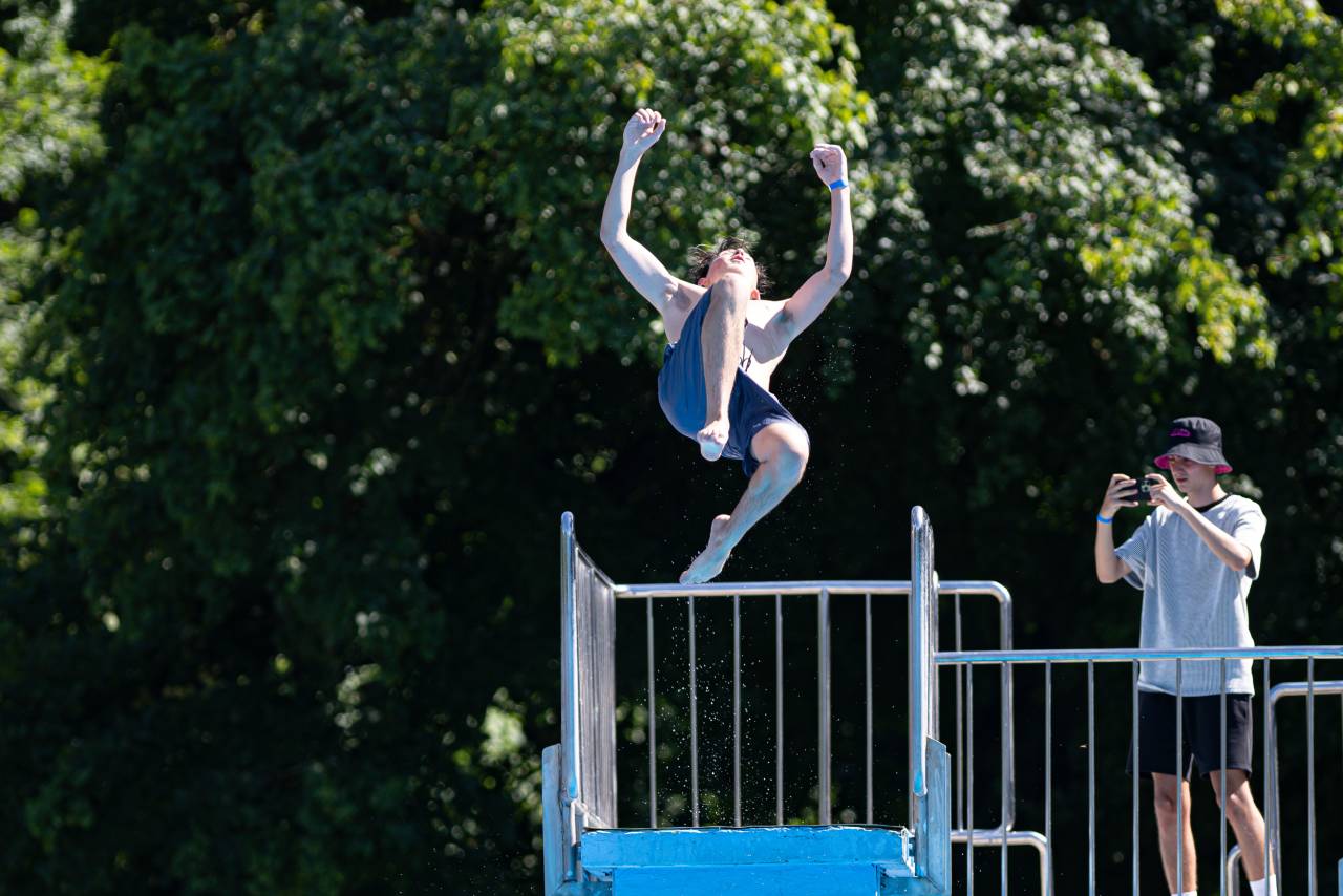 Na Letnem kopališču v Murski Soboti je danes pestro, najprej so se obiskovalci soboškega kopališča preizkusili v skoku v vodo iz stolpa.