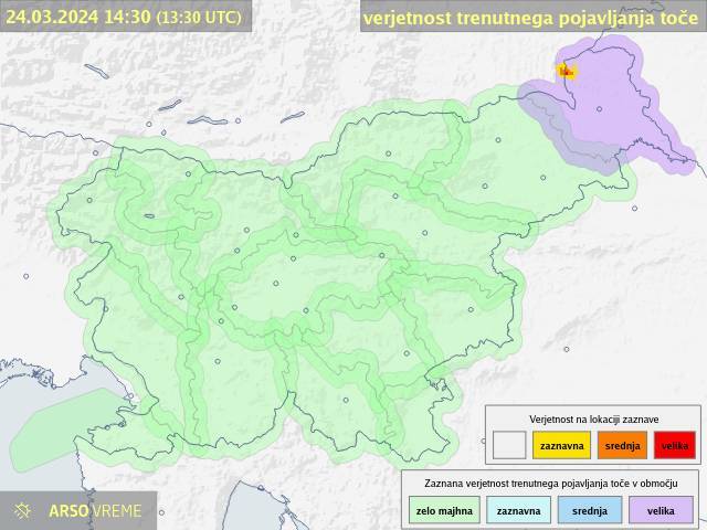 Agencija Republike Slovenije za okolje je za Pomurje izdala vijoličasto opozorilo za veliko verjetnost trenutnega pojavljanja toče.