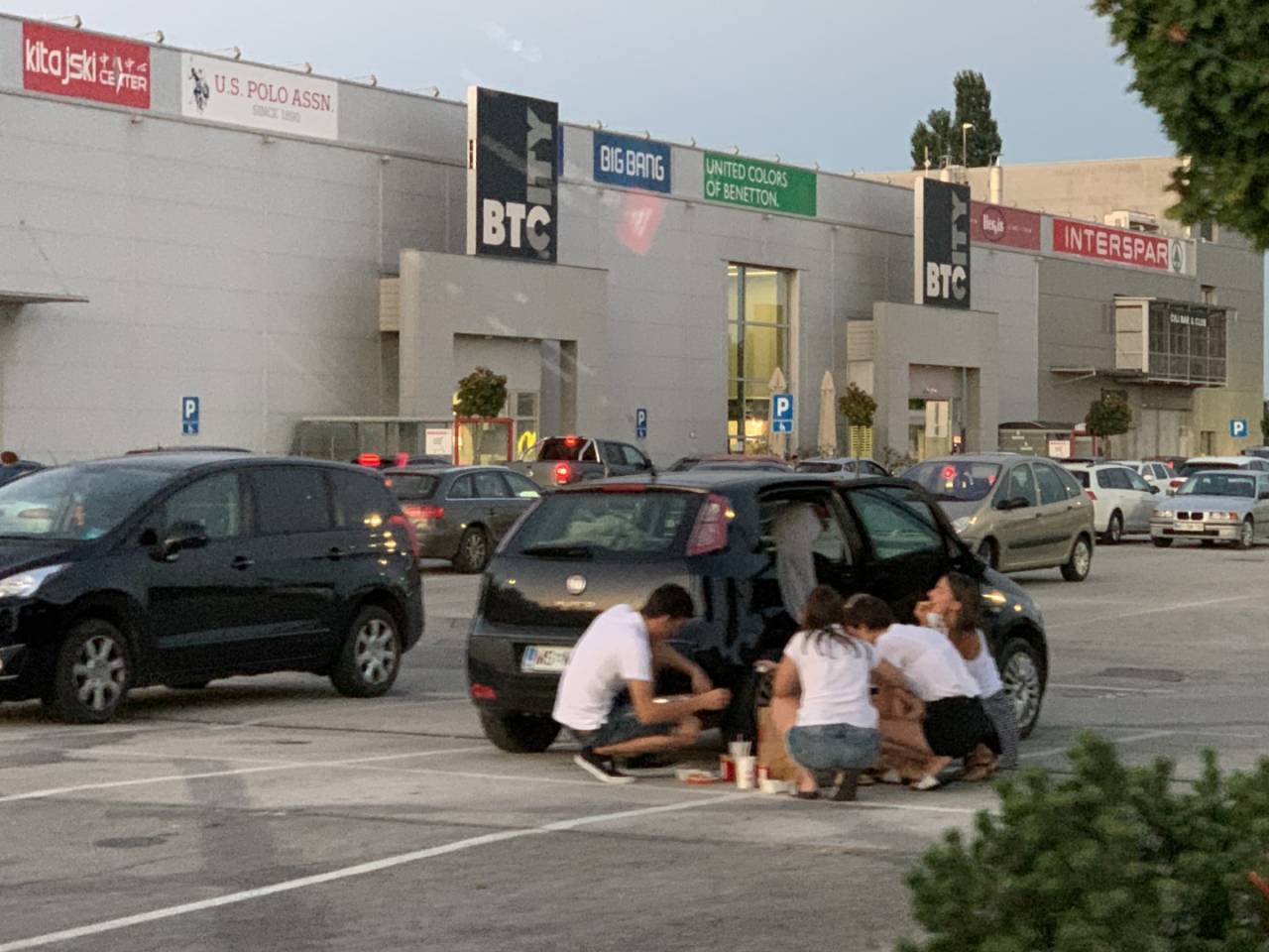 Tudi pred vhodom v restavracijo pa se nabira gneča in varnostniki skrbijo, da stranke vstopajo posamično oziroma ob istočasni sprostitvi prostora v notranjosti. Nekateri so pa, kot kaže, tako lačni, da so si svoj obrok privoščili kar na parkirišču.