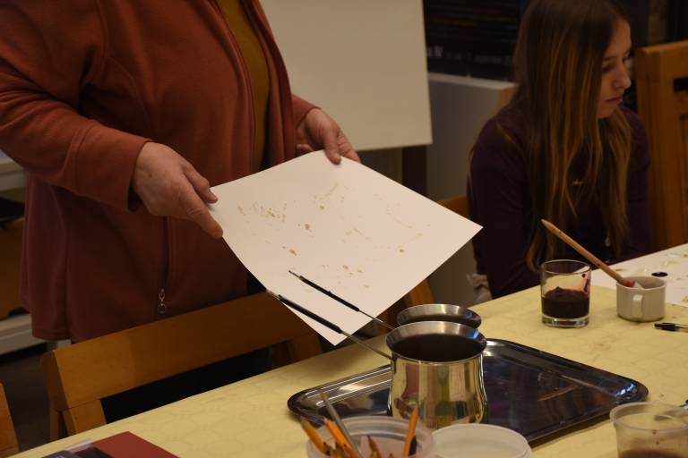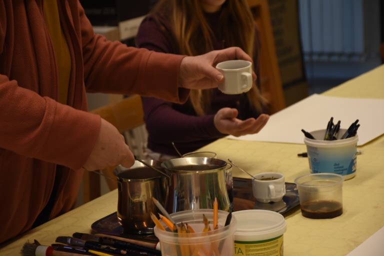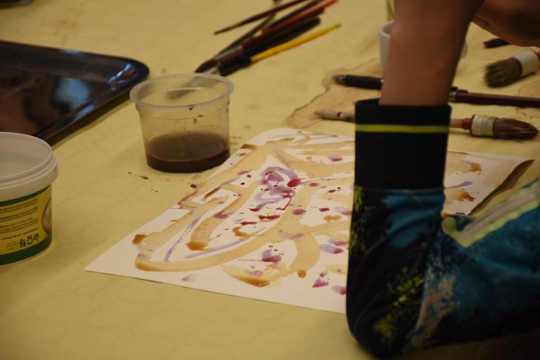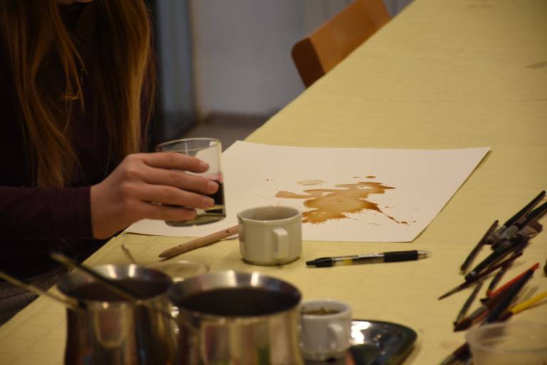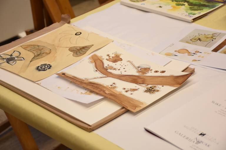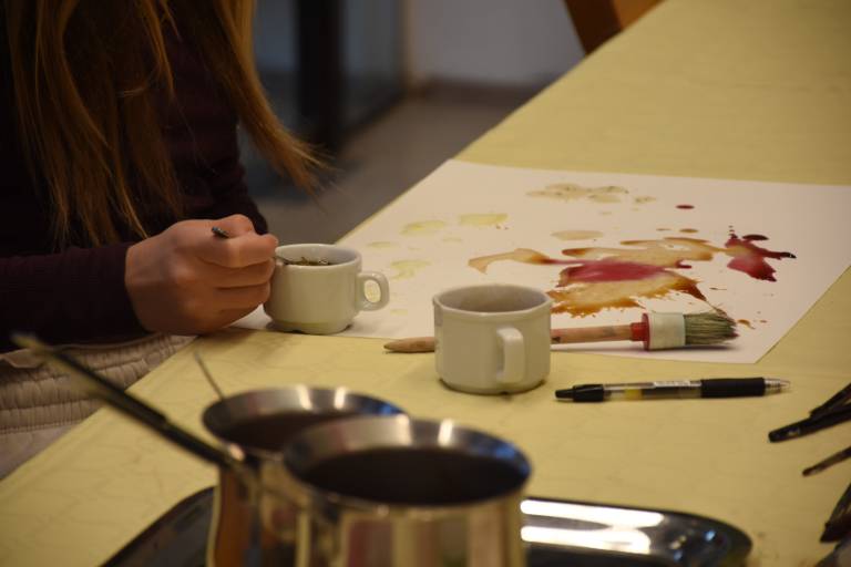 Posebnost delavnice je bila uporaba naravnih barvil, s katerimi so otroci eksperimentirali pri svojem ustvarjanju. Namesto klasičnih vodenk ali akrilnih barv so uporabljali kavo, sok korenčka in hibiskusa, ki so dali njihovim risbam edinstvene tople odtenke.