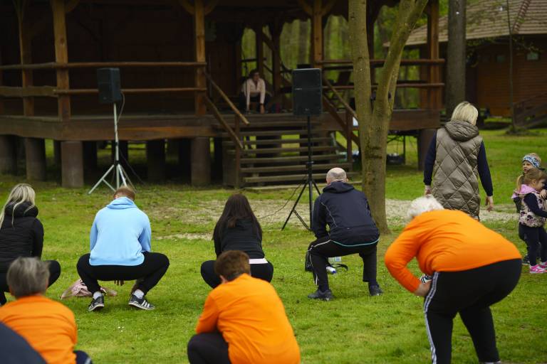 Zanimanje so pritegnile tudi vaje za krepitev gibljivosti in zdravja, ki jih je vodila fizioterapevtka Metka Vlaj. Udeleženci vseh starosti so z navdušenjem sodelovali in se razgibali pod krošnjami dreves.