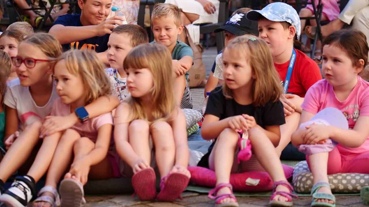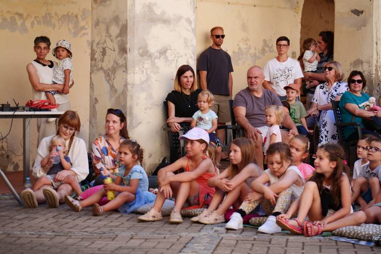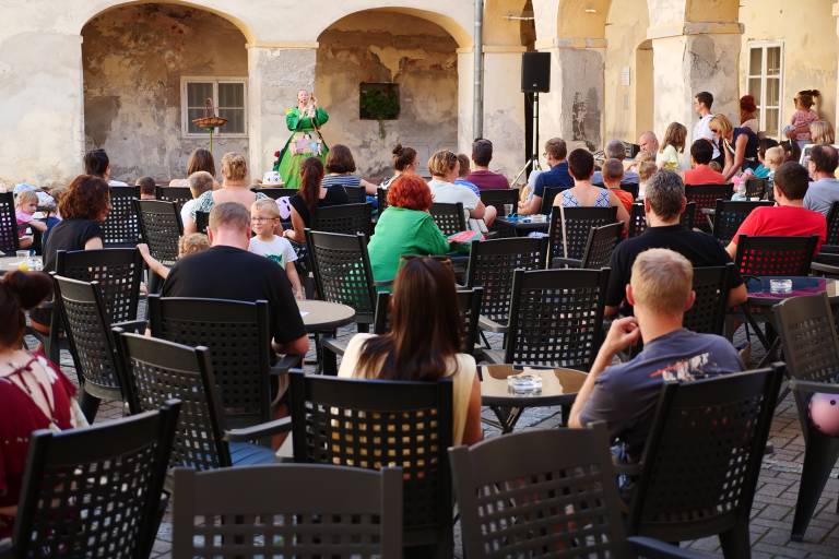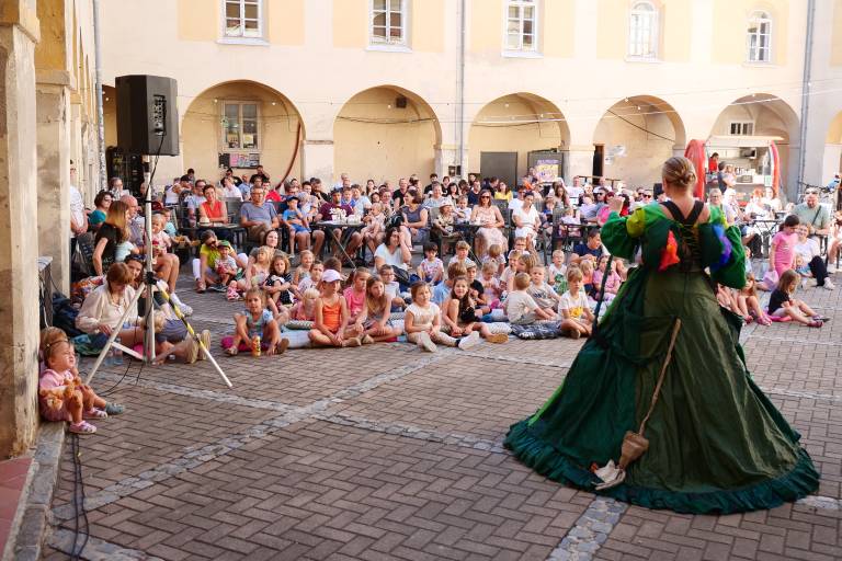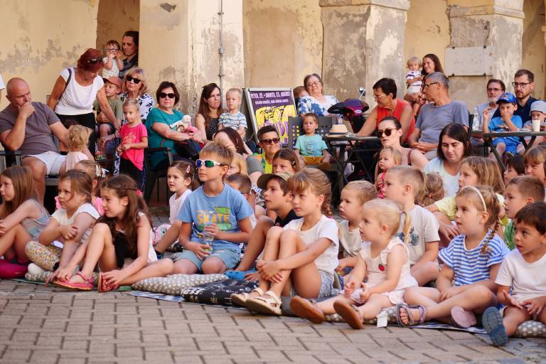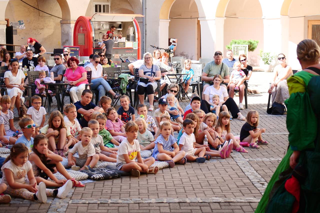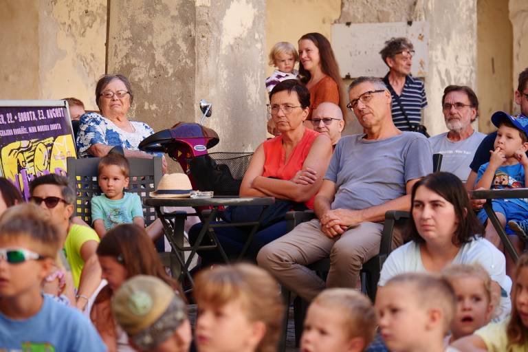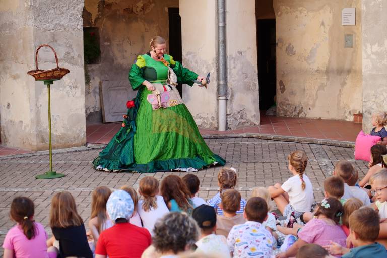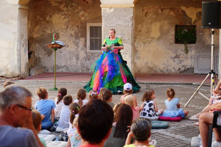 Grajsko dvorišče v Murski Soboti je danes dopoldne znova oživelo z otroškim smehom in pravljično energijo, saj je v okviru Soboškega poletja 2025 Gledališče Labirint uprizorilo predstavo Metuljček in Metuljčica.