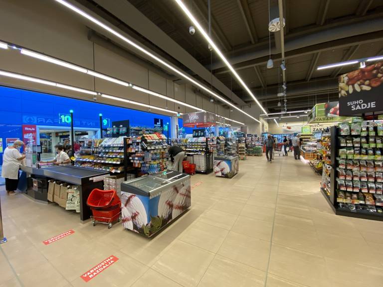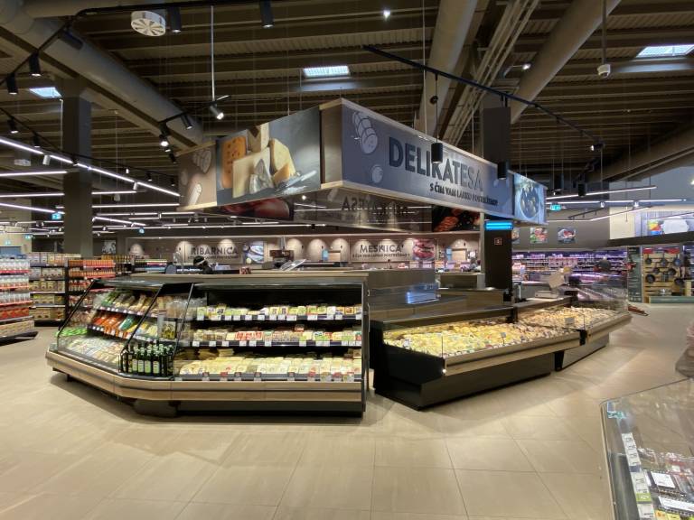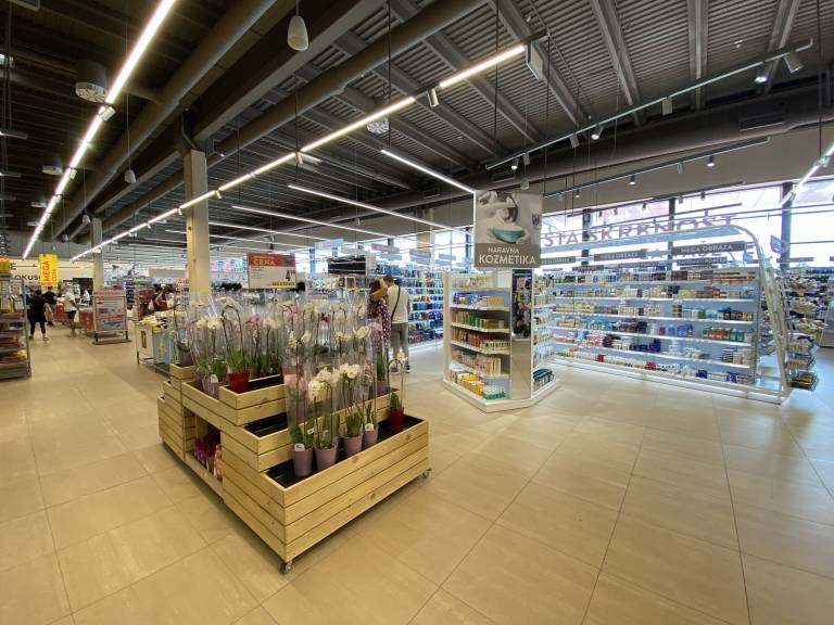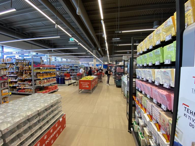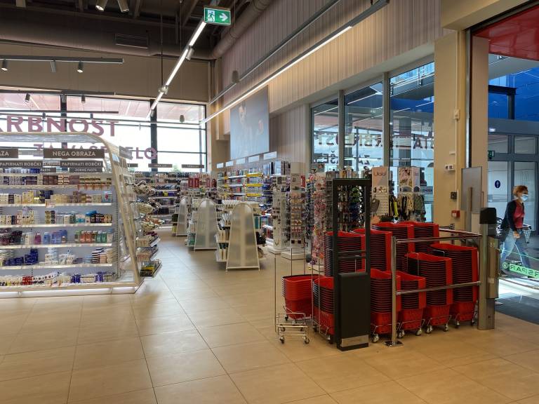 Takoj ob vhodu v trgovino se nahaja široka ponudba kozmetike in neživil, proti koncu nakupovalne poti pa bodo obiskovalci lahko izbirali med raznovrstno paleto mlečnih in zamrznjenih izdelkov.