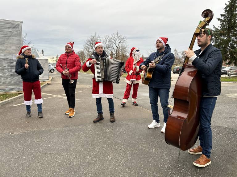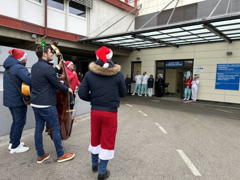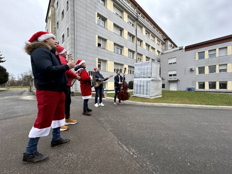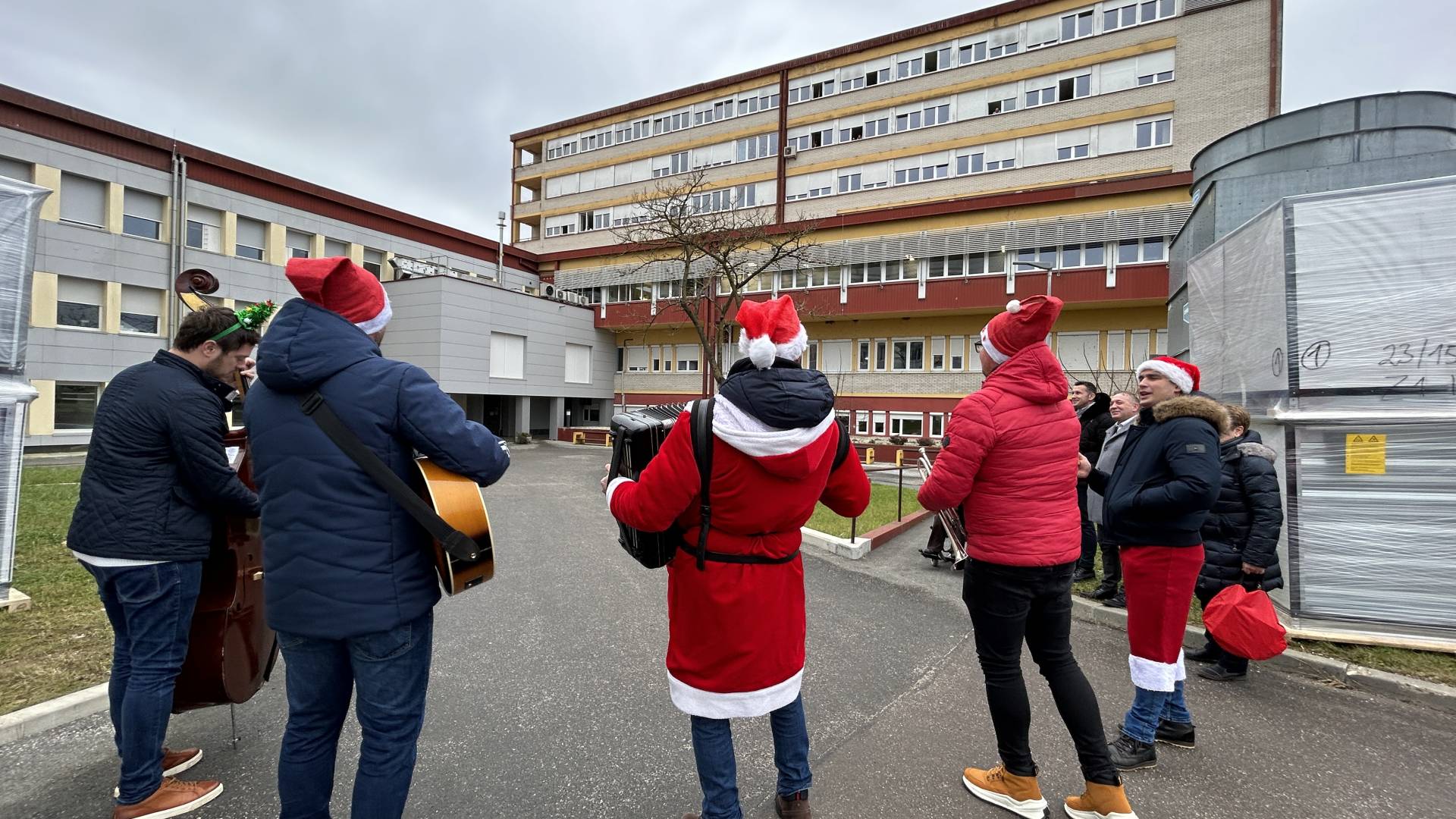 Kmalu po tem, ko so nastavili svoje inštrumente, so božično obarvani muzikanti že poskrbeli za prepoznavne božične melodije in le nekaj trenutkov za tem so se na oknih že prikazali bolniki in predvsem zaposleni, ki jim je glasba polepšala dan v službi.