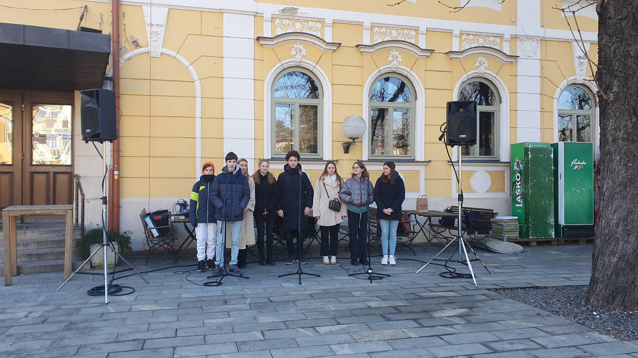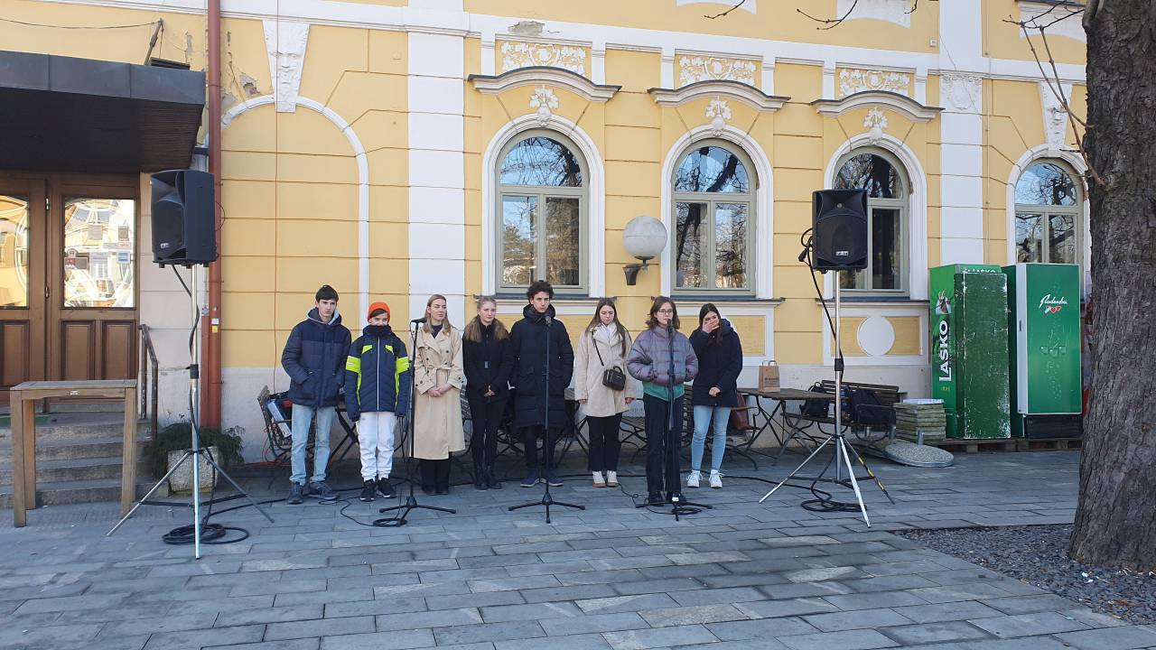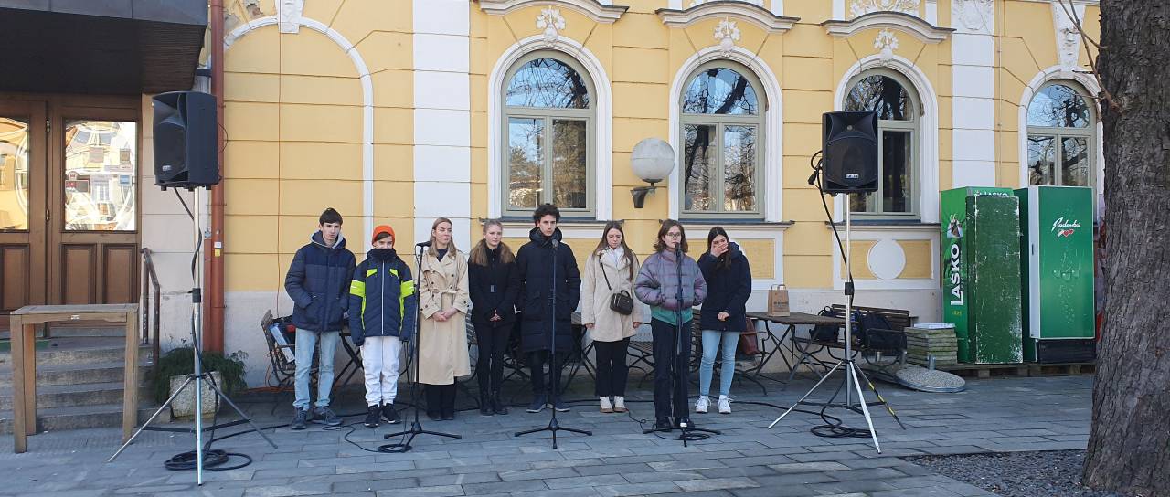 V mestnem središču pred restavracijo Zvezda so ob slovenskem kulturnem prazniku mladi igralci gledališke šole recitirali poezijo.