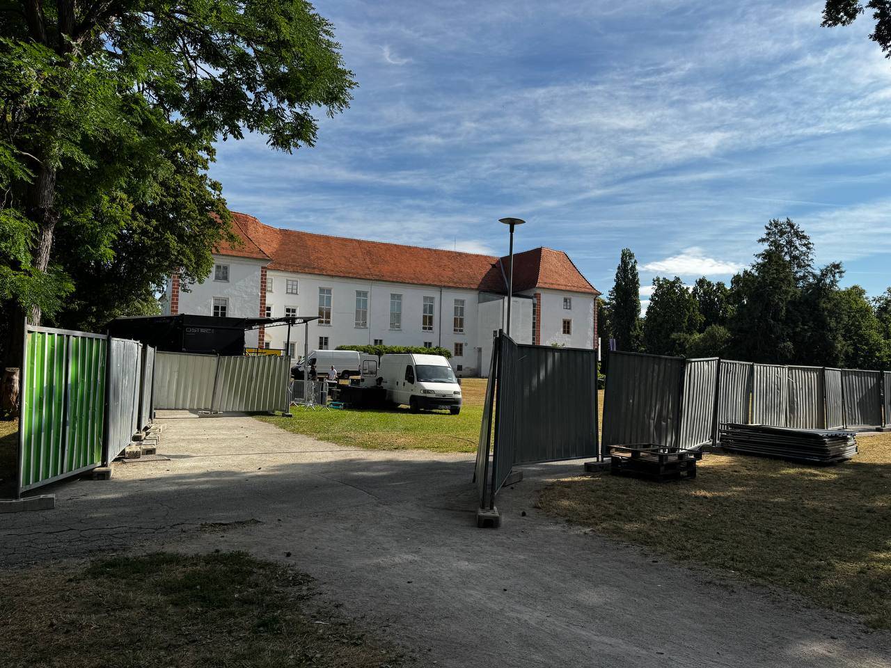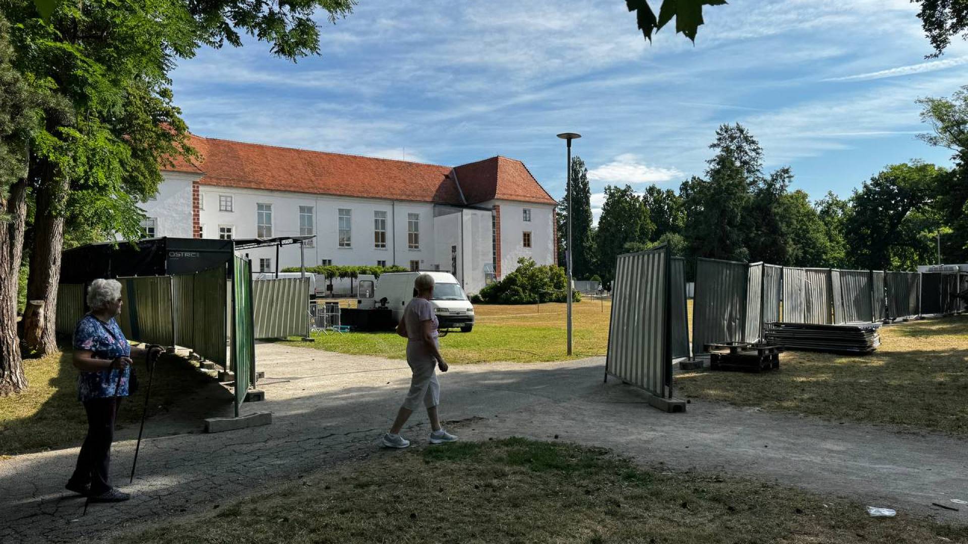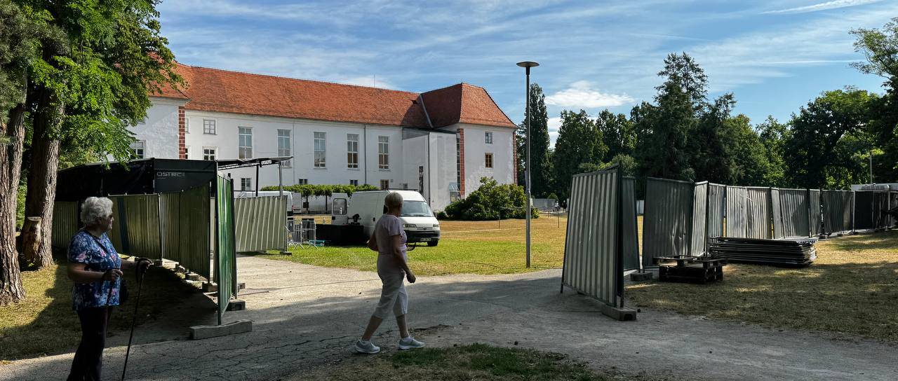 V mestnem parku v Murski Soboti so danes dopoldne v teku intenzivne priprave na večerni dogodek Žilina noč. Delavci postavljajo oder in varnostne ograje okoli prizorišča, kjer se bo nocoj odvijala osrednja zabava.