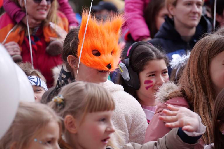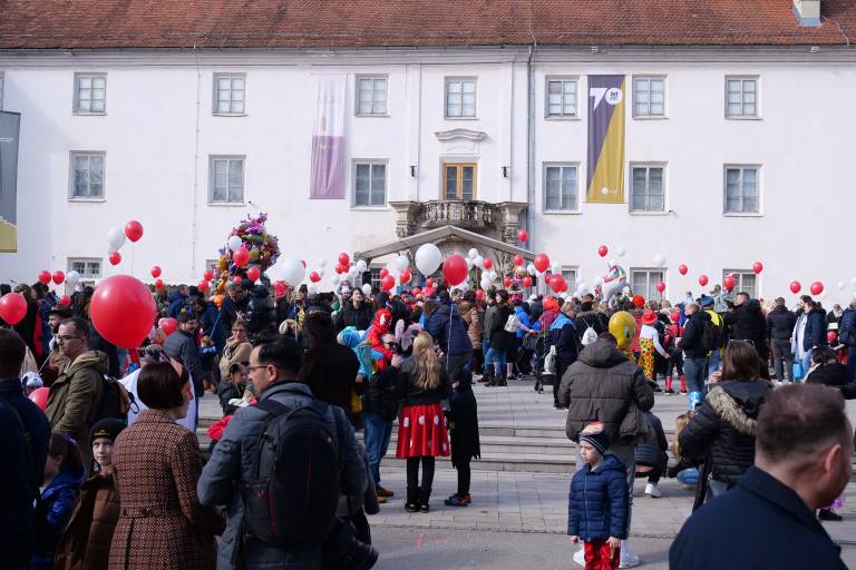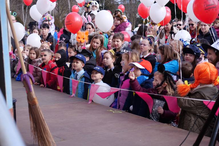 Grajska ploščad v mestnem parku je danes zažarela v barvah pustnih mask in razigranih otroških nasmehov.
