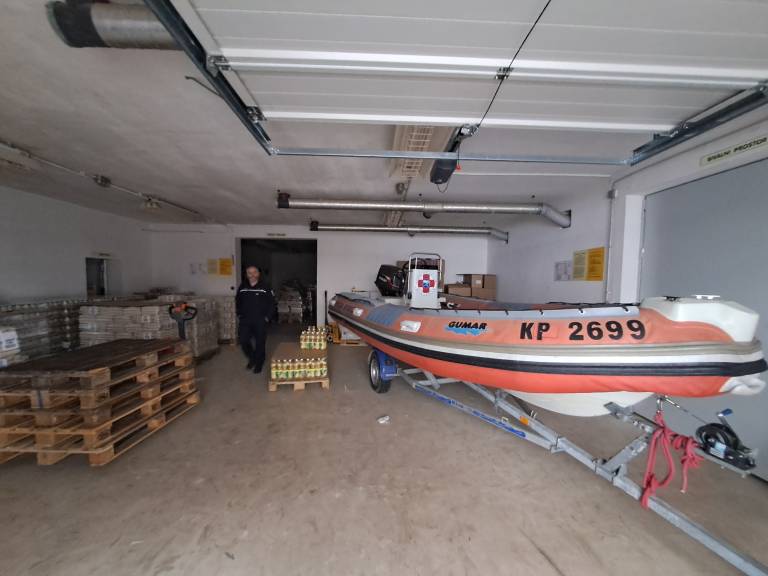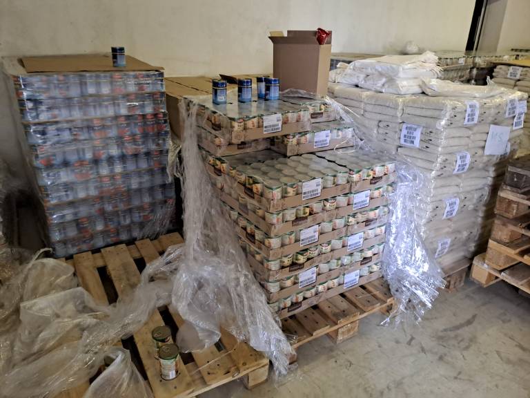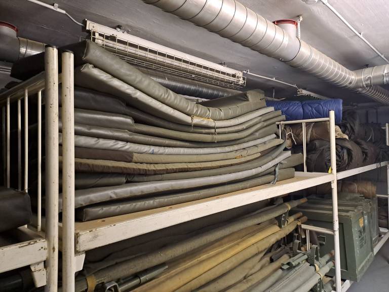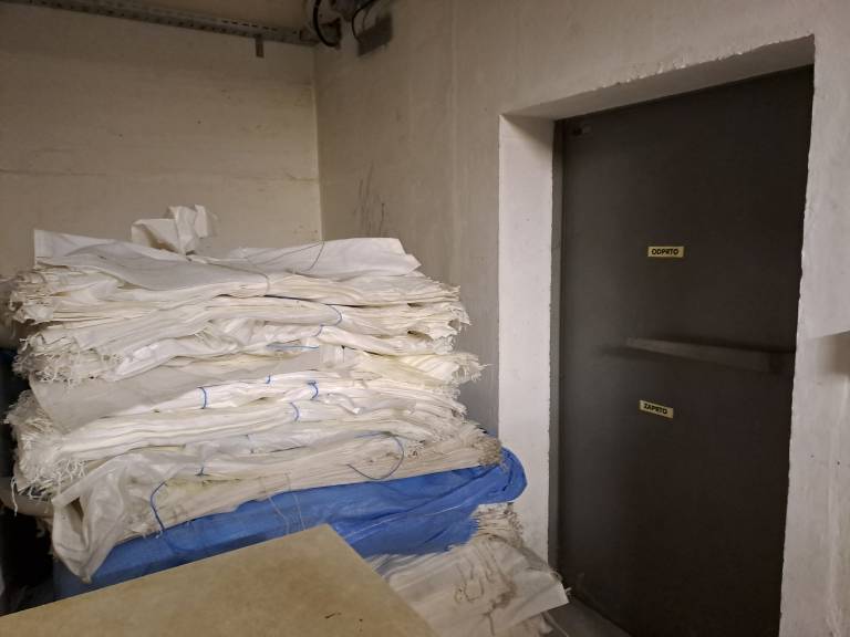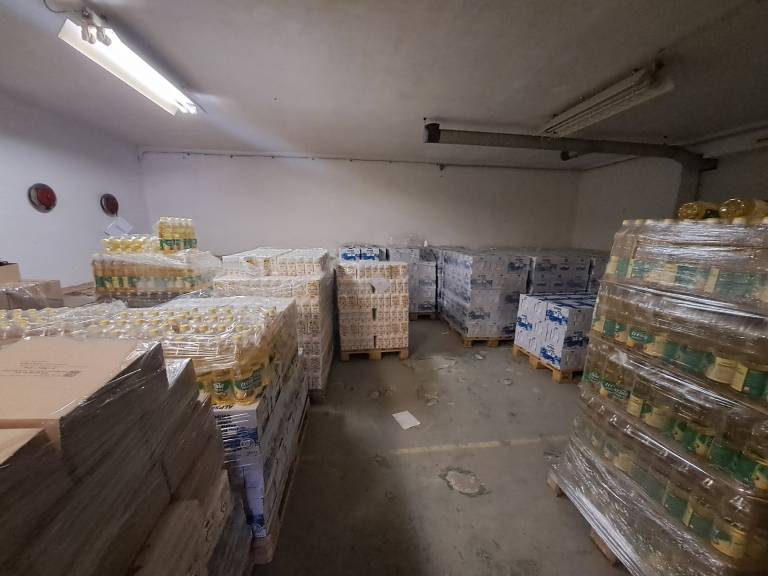 Zaklonišče služi tudi kot skladišče Rdečega križa, kjer smo med drugim opazili zaloge olja, moke, mleka in fižola v konzervi.