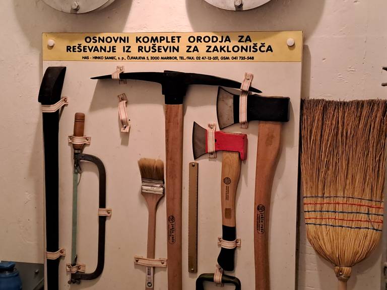 Vsako zaklonišče je opremljeno z osnovnim kompletom orodja, namenjenega reševanju iz ruševin, da zagotovi varnost in pomoč v nujnih situacijah.