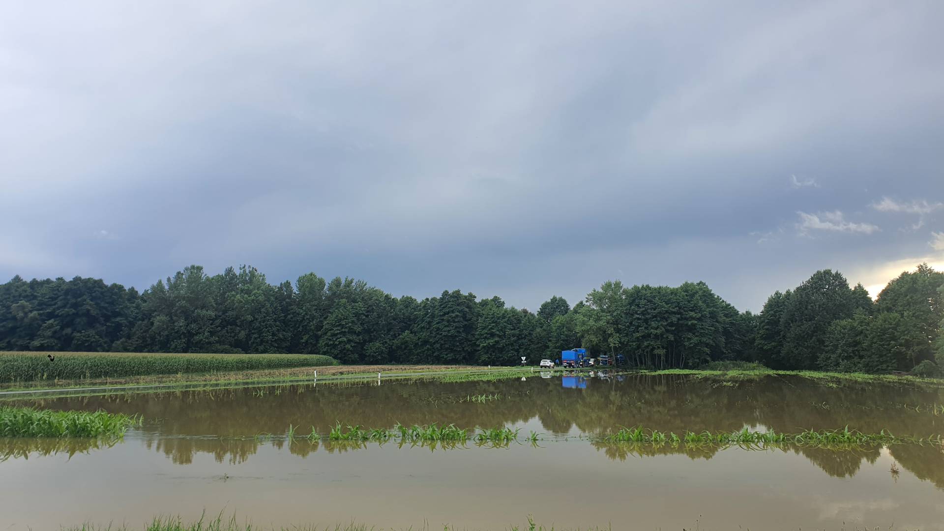 Nivo vode se znižuje tako ob poplavnih vrečah kot na njivah med Dolnjo Bistrico proti Veliki Polani v bližini Žižkov.