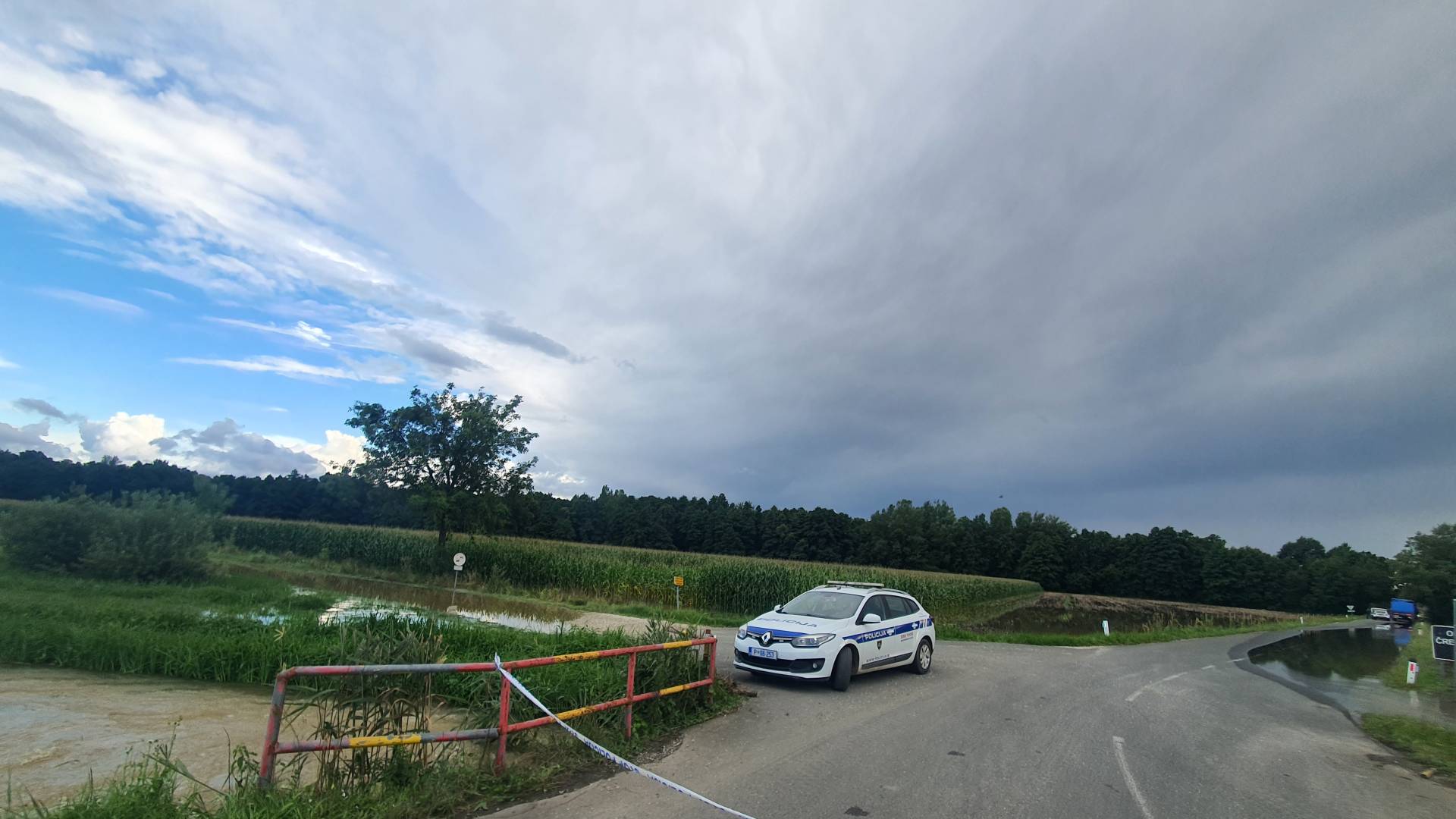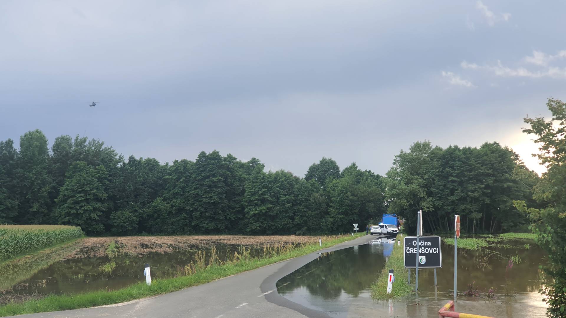 Na cesti do Dolnje Bistrice sta aktivni dve visokozmogljivi črpalki civilne zaščite, ki prečrpavata vodo na drugo stran ceste, od koder se ta steka proti Hotizi.