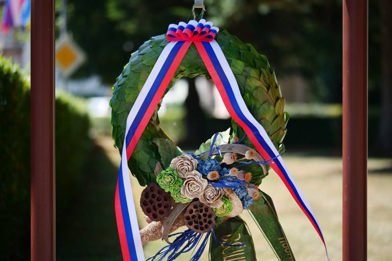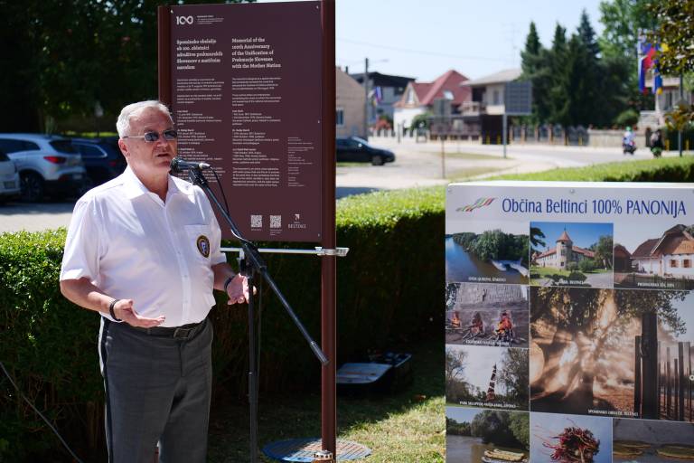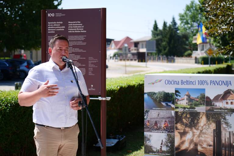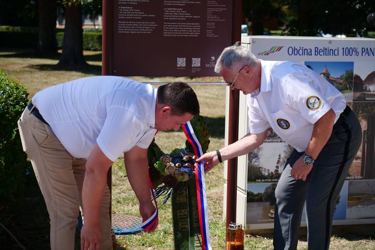 Pred cerkvijo svetega Ladislava v Beltincih je bila danes slovesnost s položitvijo venca ob spominskem obeležju v čast vsem velikim možem Prekmurja.