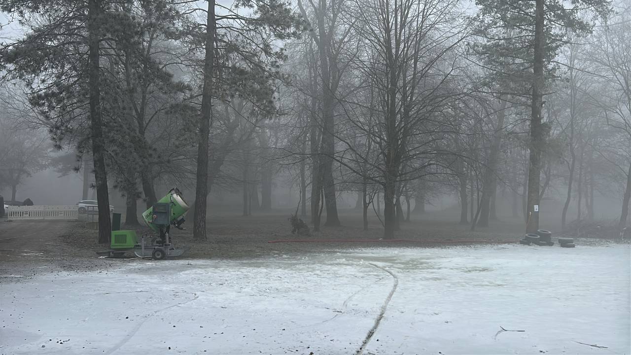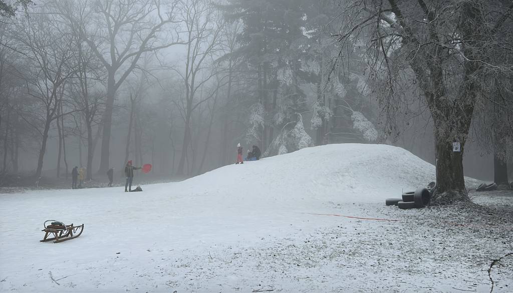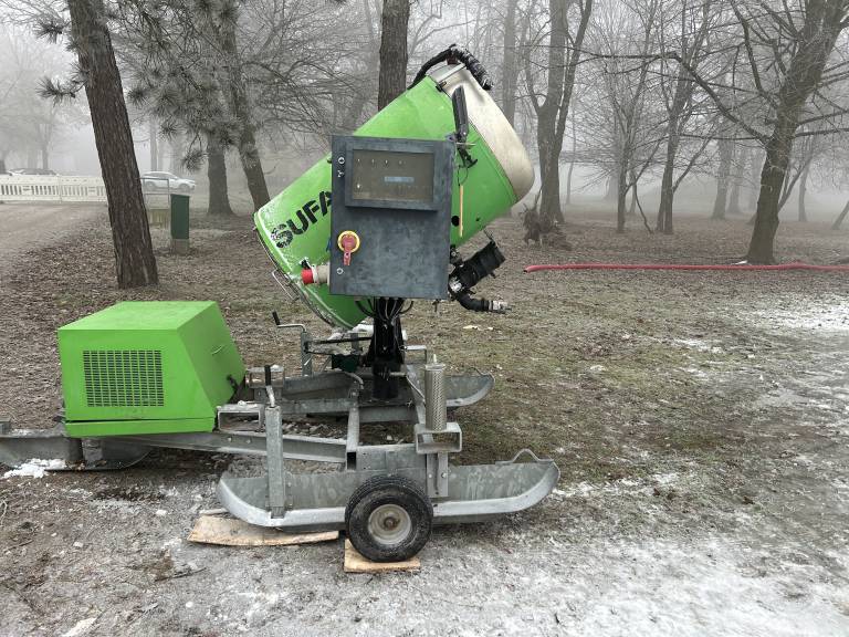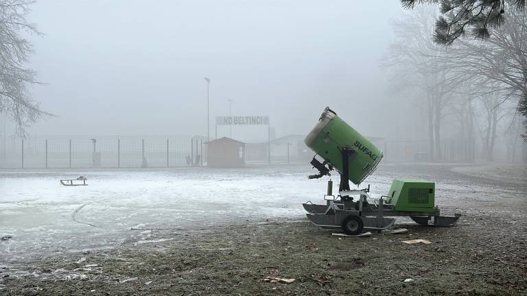 Za popestritev so prižgali snežni top, ki v parku pri beltinškem gradu mlajšim omogoča igrive radosti na umetnem snegu.