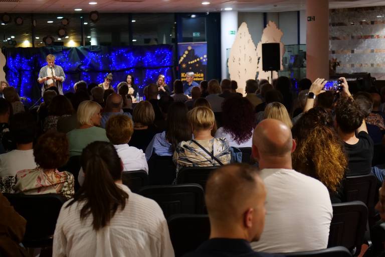 Zaradi nepredvidljivih vremenskih razmer se je včerajšnji dogodek »Knjižnica pod zvezdami«, ki je del festivala Dnevi poezije in vina, preselil z grajskega dvorišča v avlo Pokrajinske in študijske knjižnice Murska Sobota.