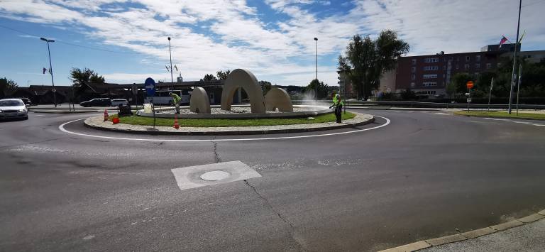 Vsake toliko je potrebno tudi očistiti krožišča, pločnike in ostalo pripadajočo infrastrukturo. Čiščenje enega izmed krožišč ta konec tedna poteka v Radencih pri avtobusni postaji, kjer med drugim pripravljajo fontano na zaščitno s posebno impregnacijo.