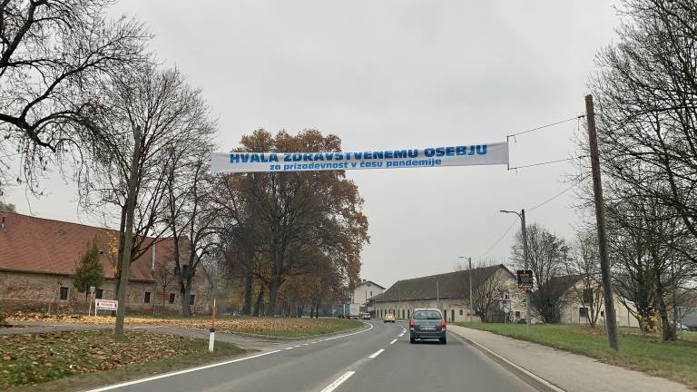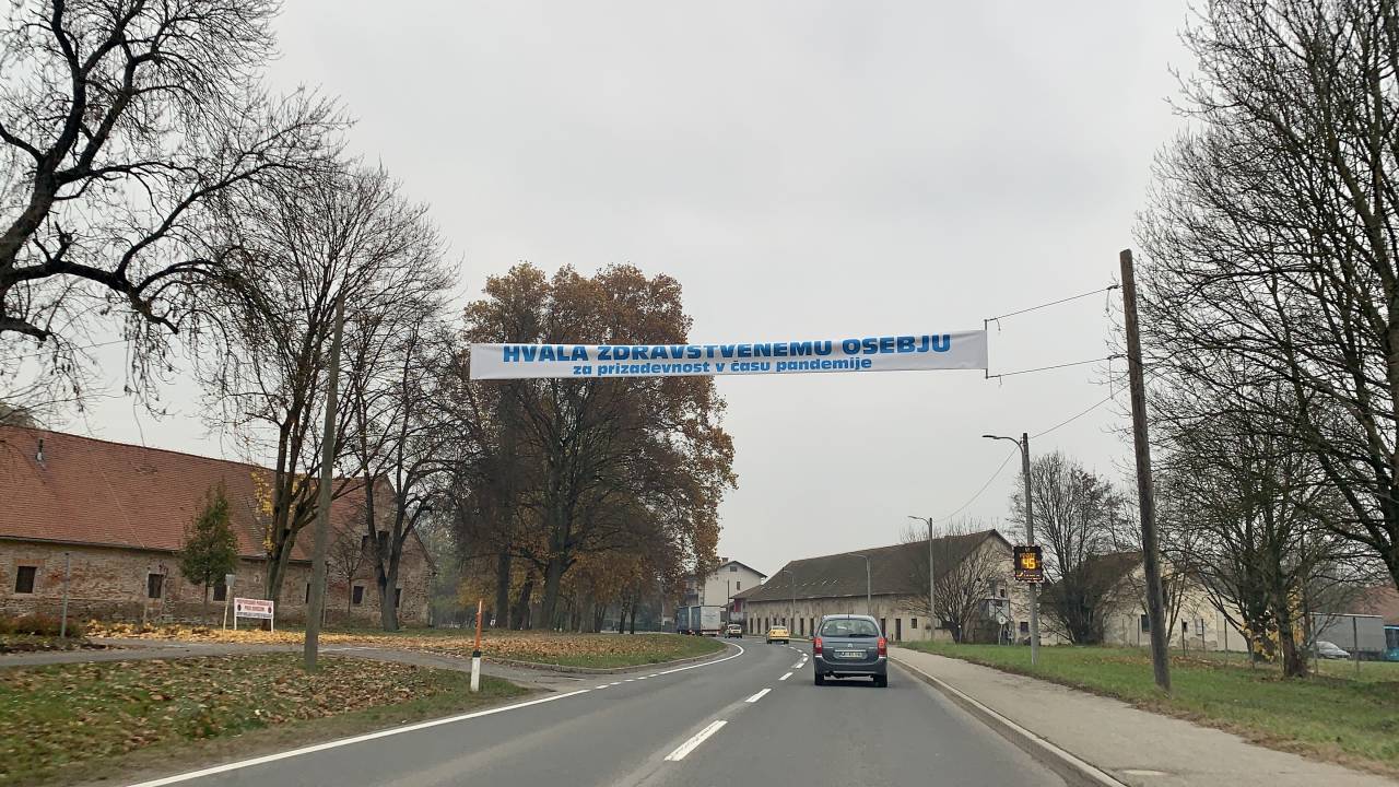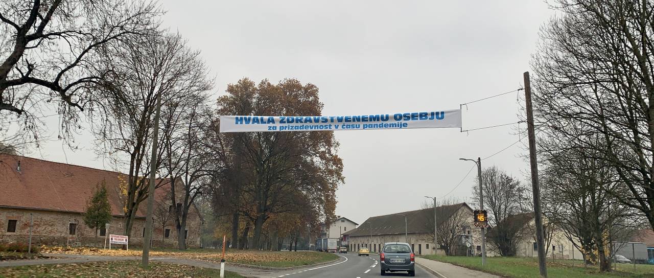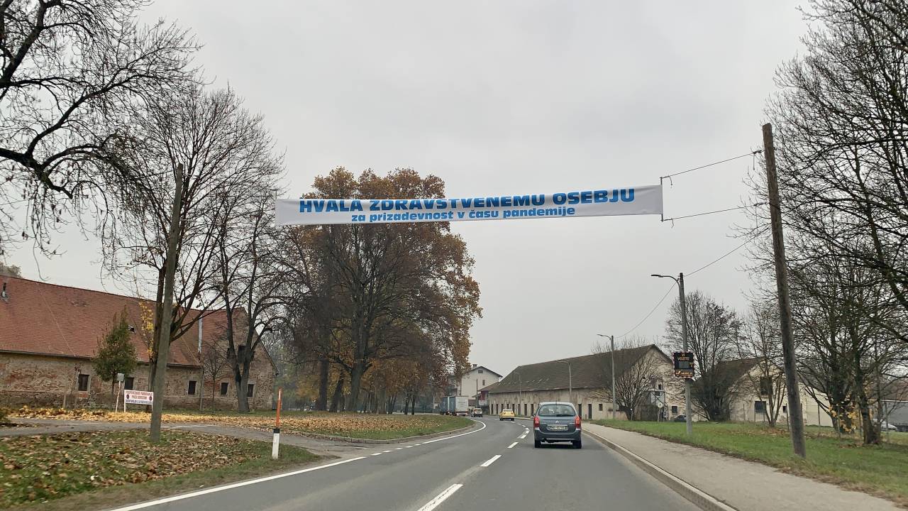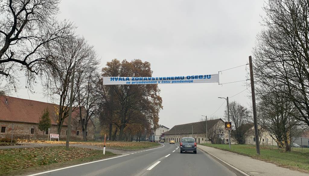 »Hvala zdravstvenemu osebju za prizadevnost v času epidemije,« je napis, ki ga je možno videti izobešenega v neposredni bližini Dvorca Rakičan.