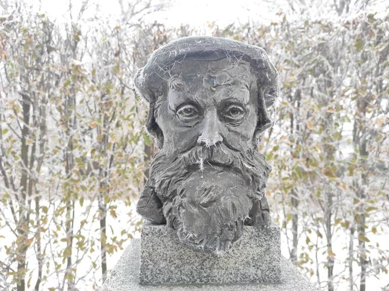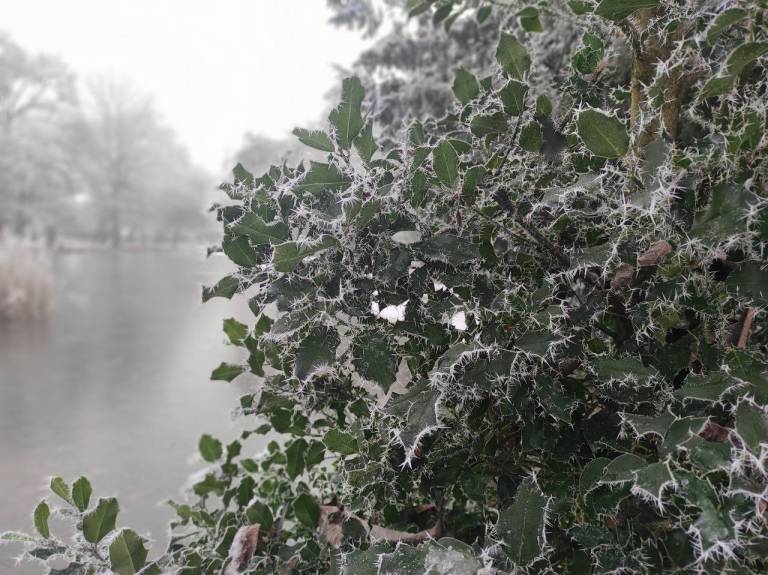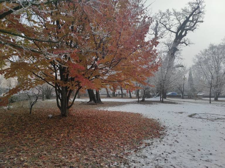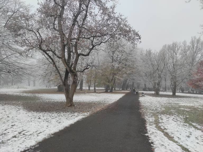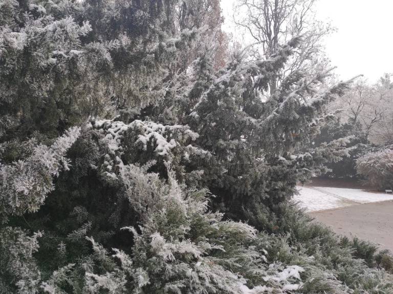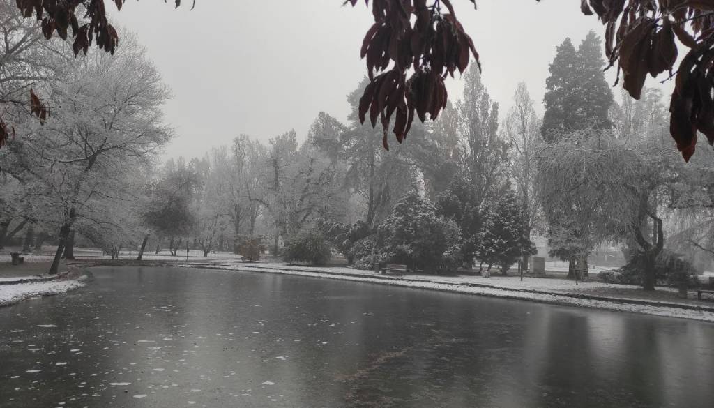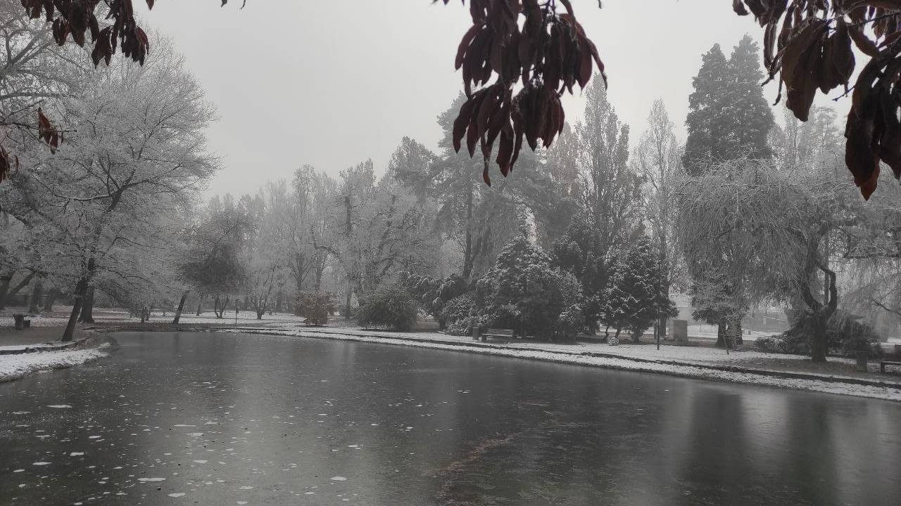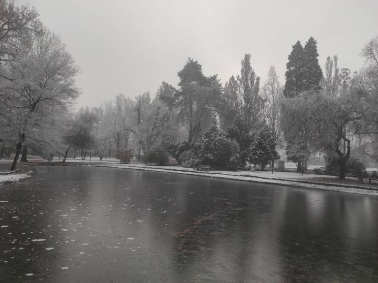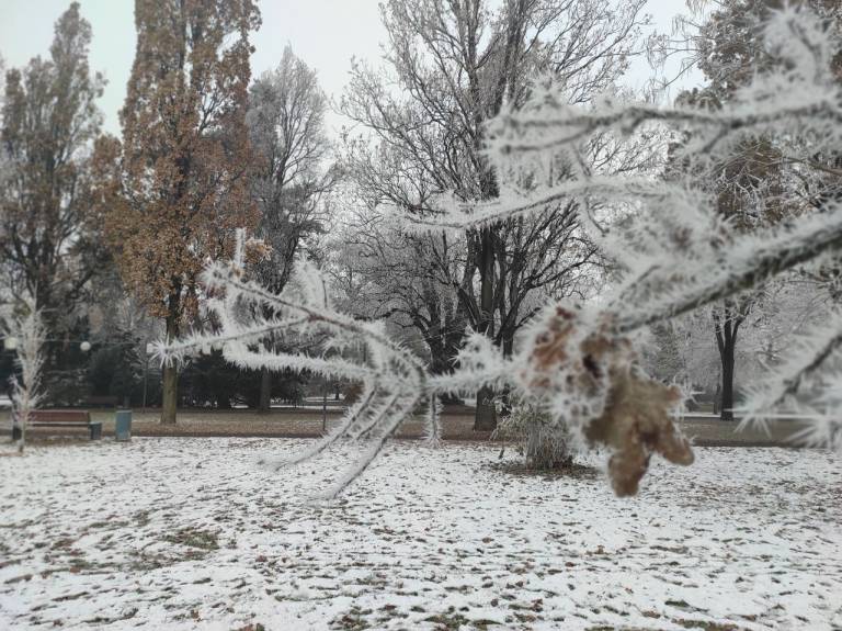 V mestu Murska Sobota so se drevesa belo obarvala z ivjem, luže so zaledenele in hrskajo pod škornji, račke v parku pa vztrajajo na majhnem delu ribniku, ki ga še ni prekril led.