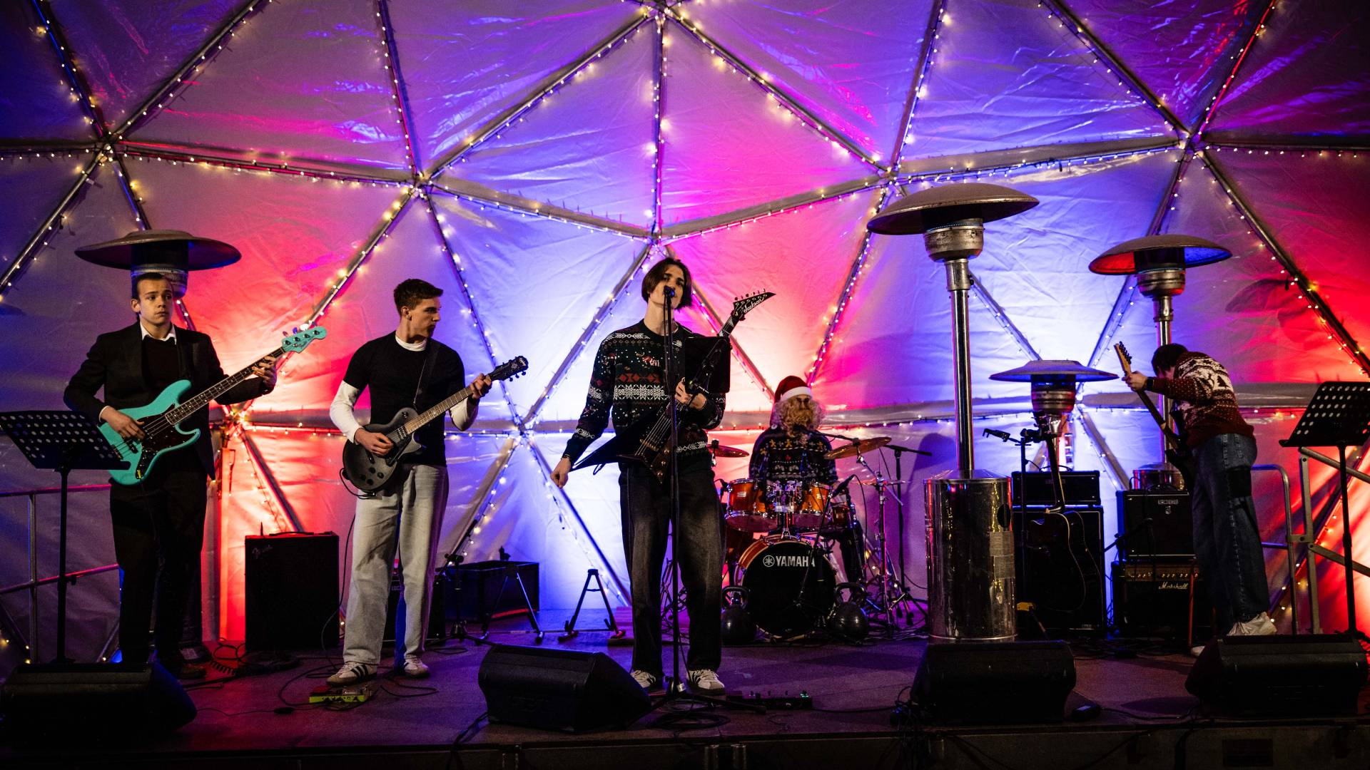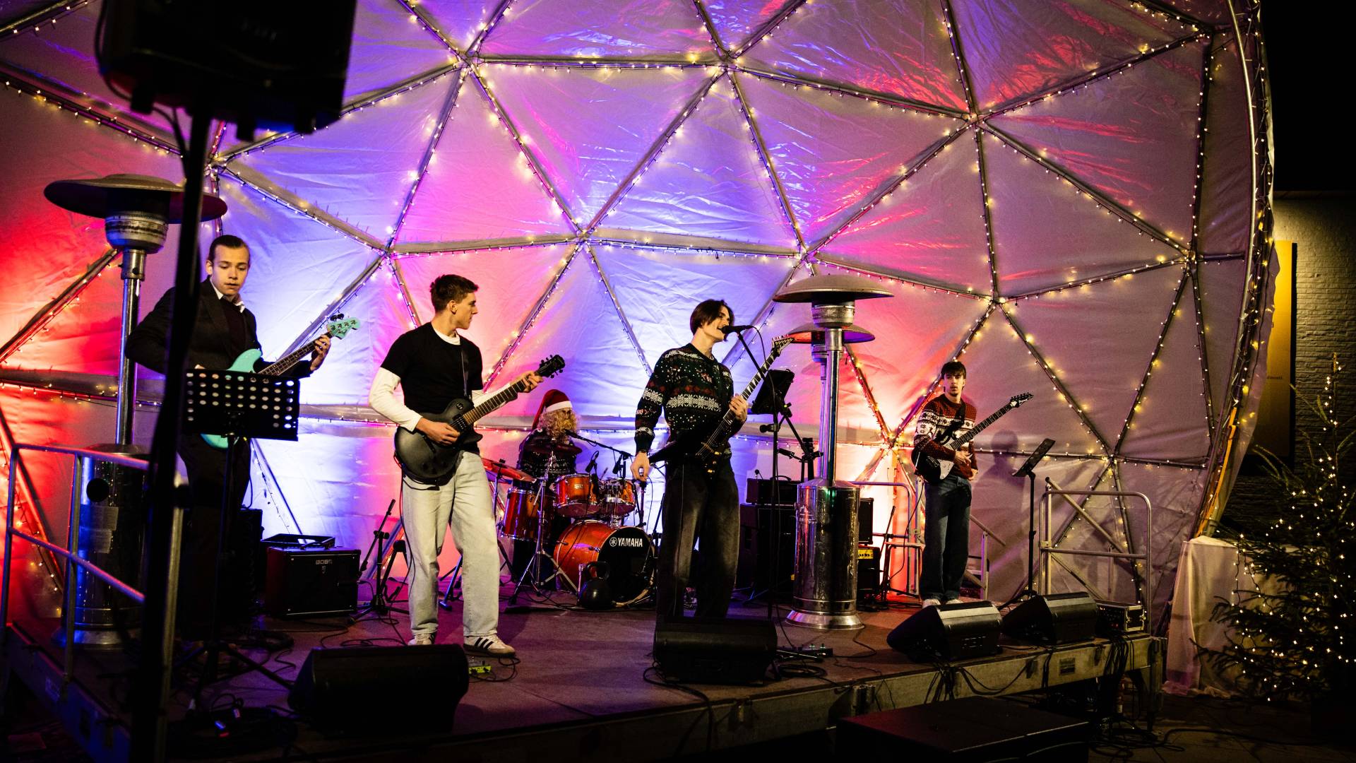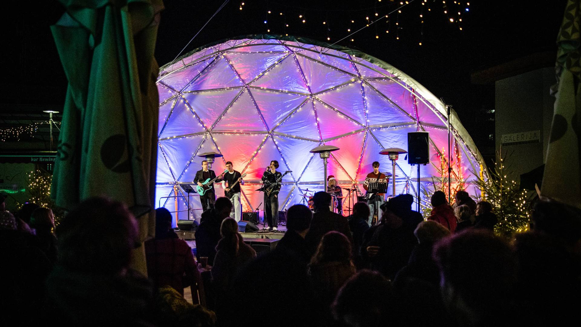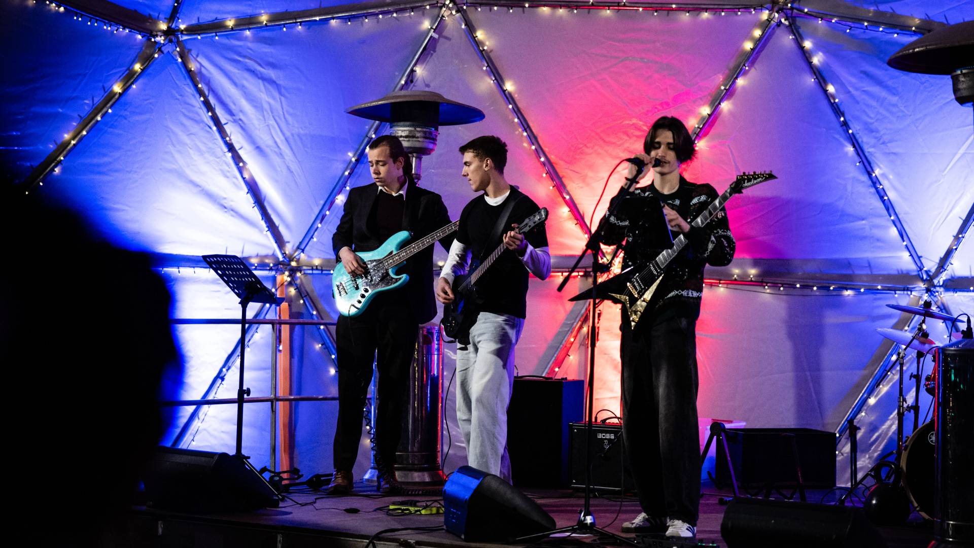 Koncert je privabil obiskovalce, ki so ob zimskem ambientu in praznično okrašenem prizorišču uživali v energičnem rock nastopu mladih glasbenikov.