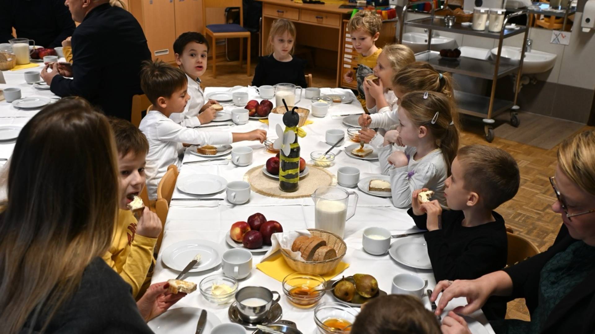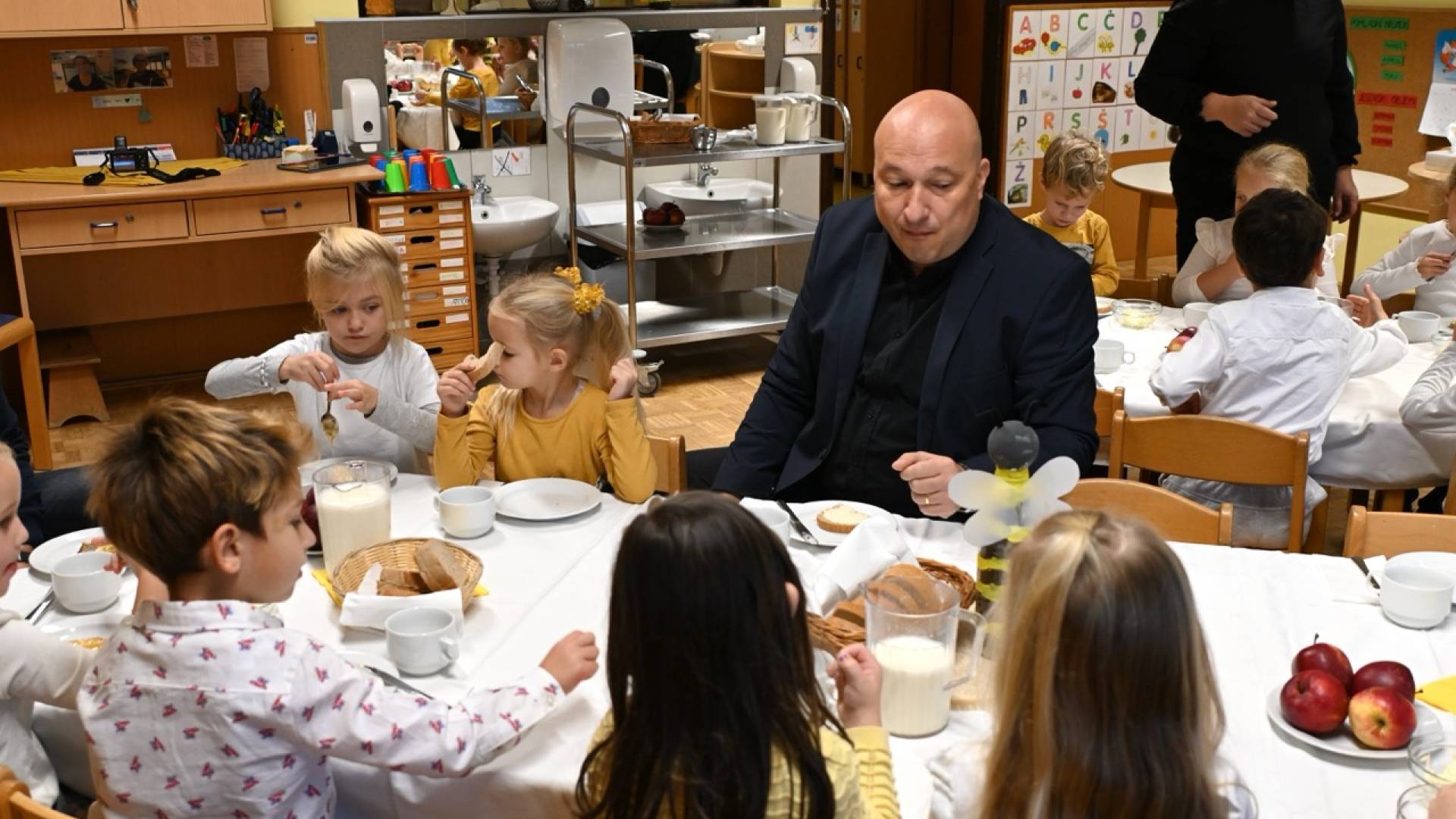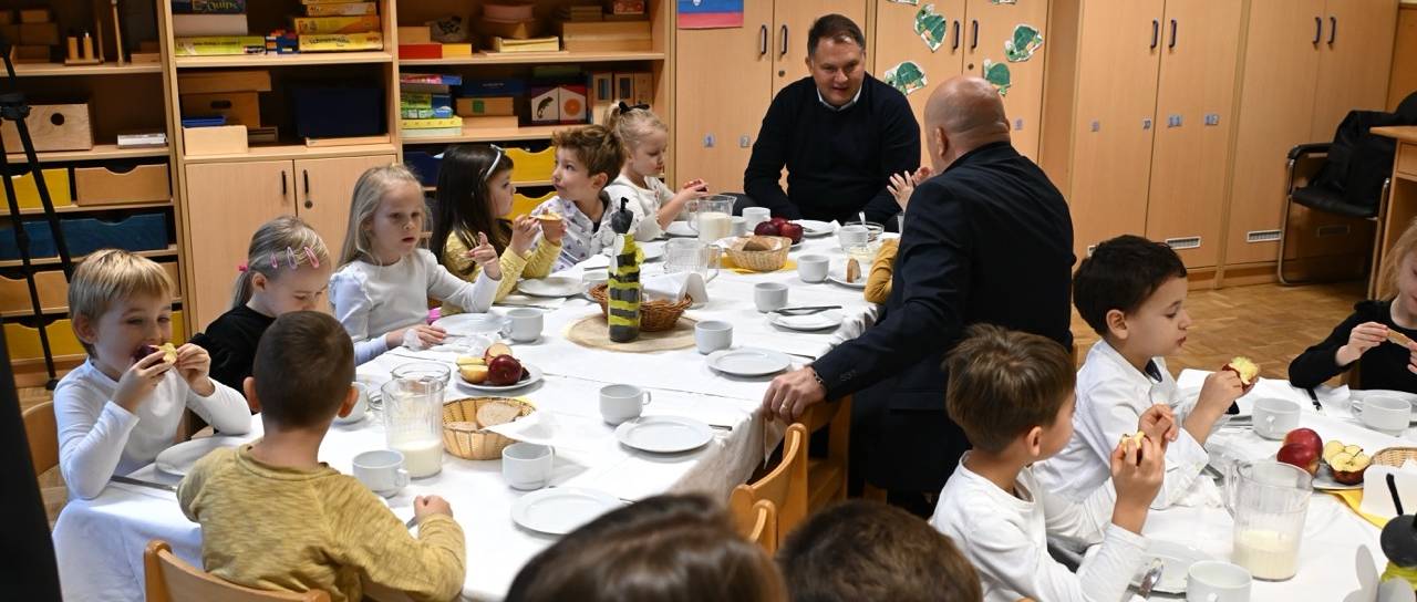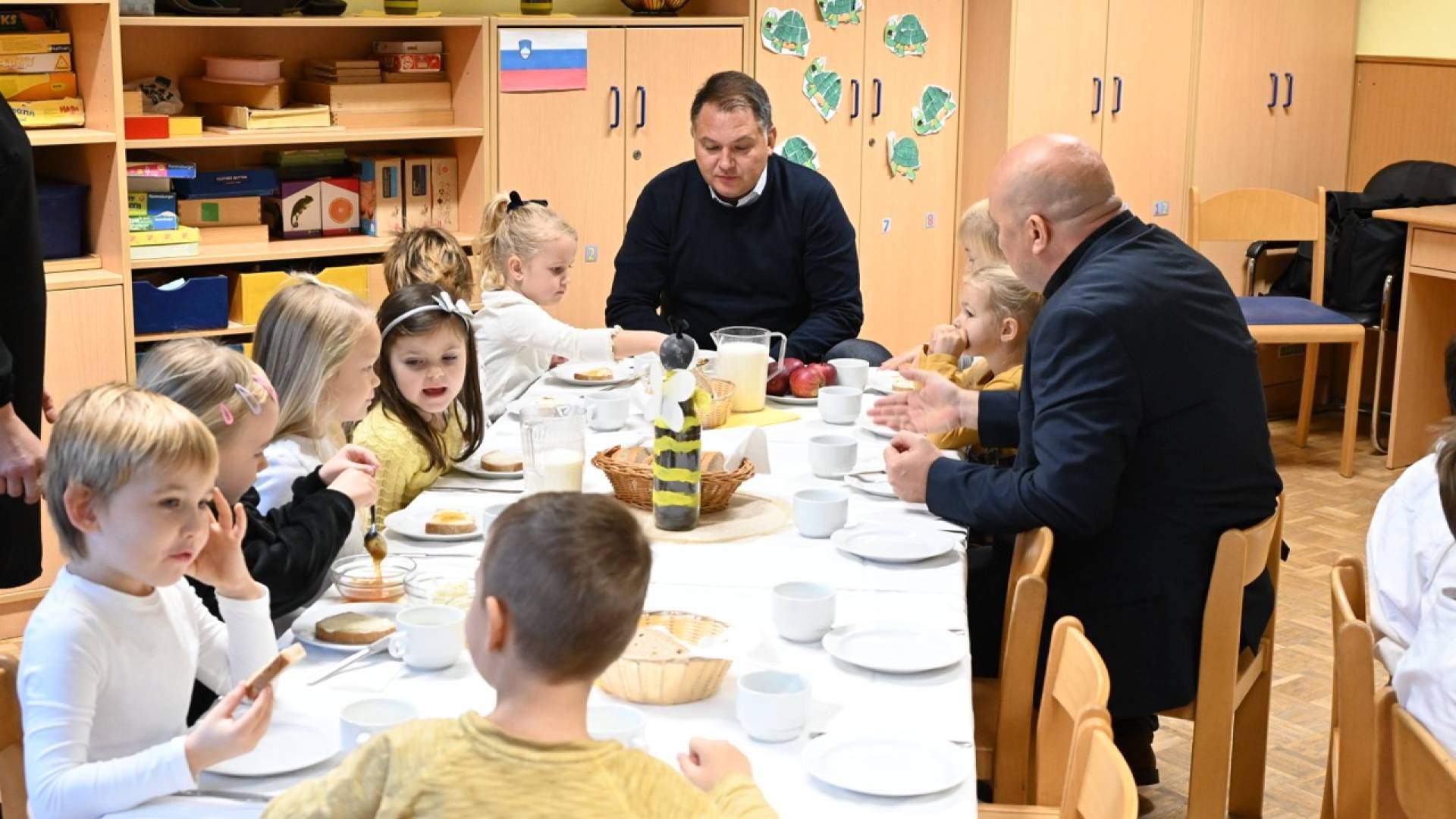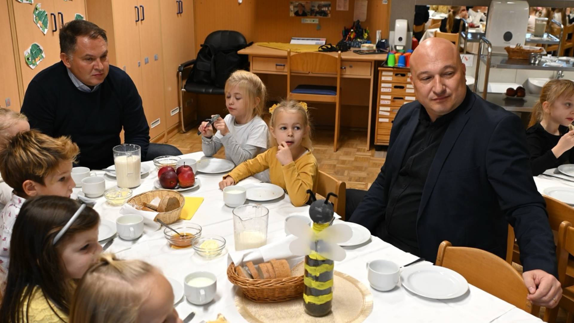 Murskosoboški župan in podžupan ob slovenskem zajtrku med otroki in učenci.