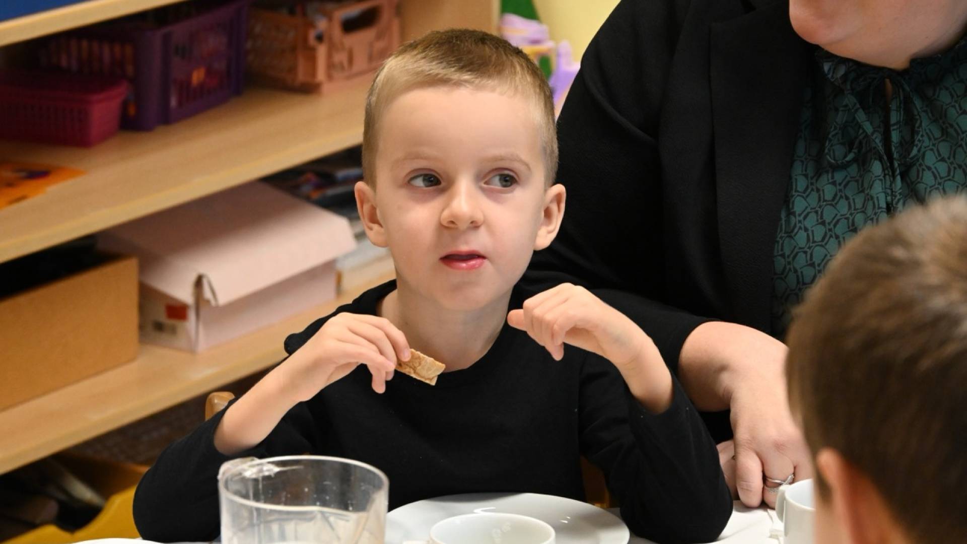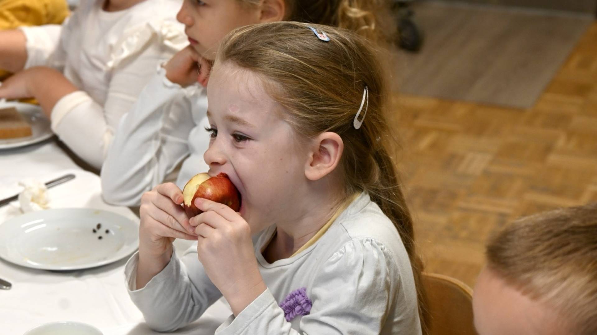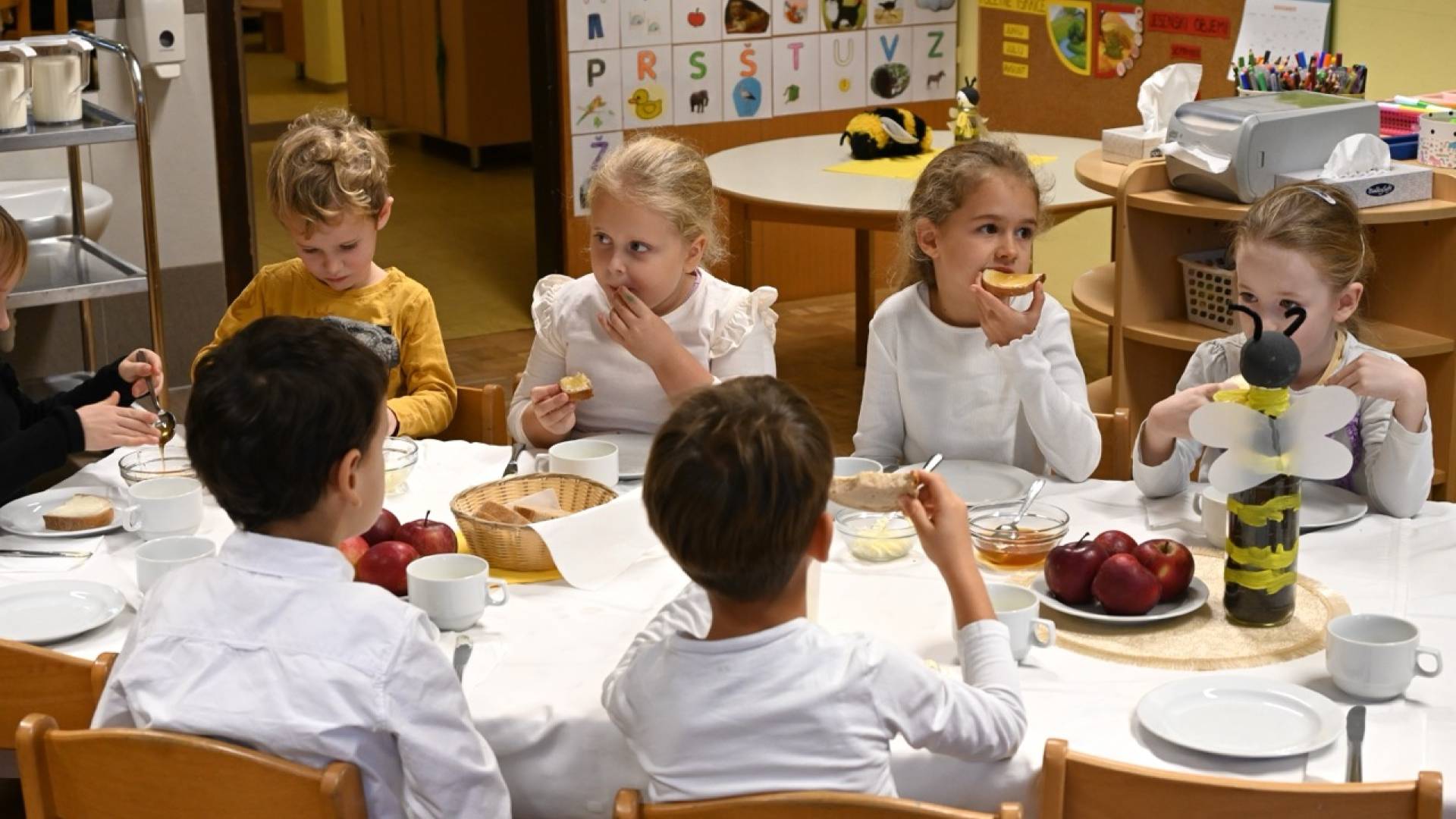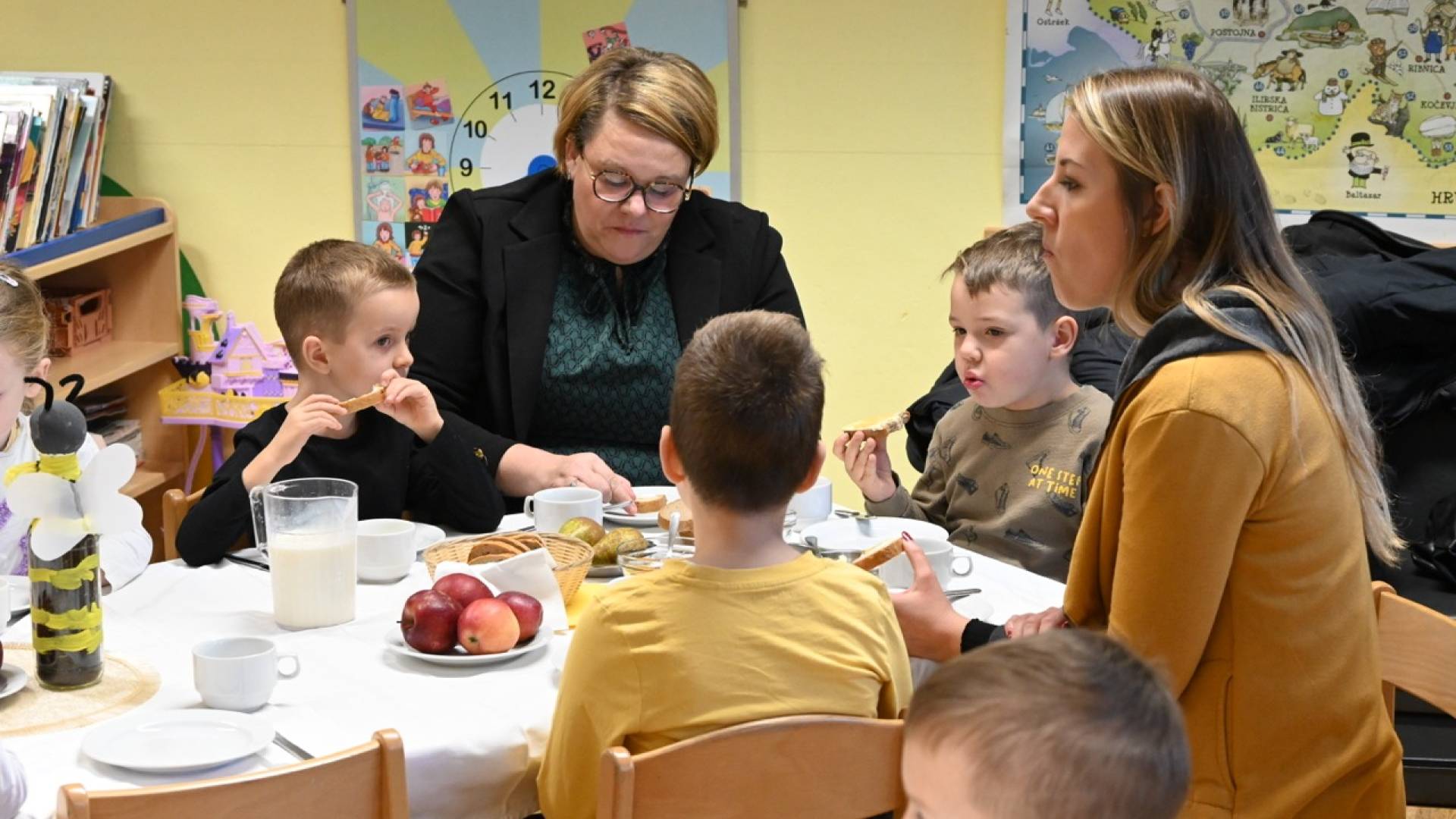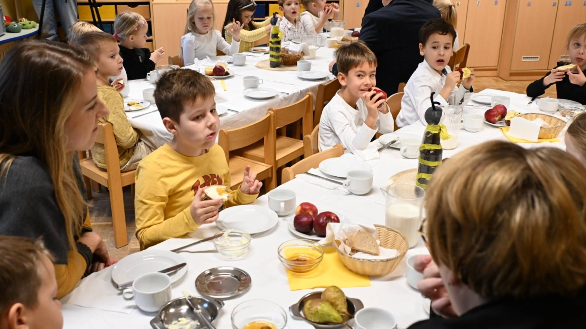 Murskosoboški župan in podžupan ob slovenskem zajtrku med otroki in učenci.