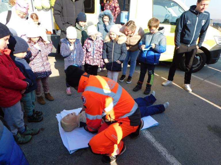 Ekipa nujne medicinske pomoči je prisotnim prikazala osnovne postopke oživljanja in uporabo defibrilatorja, kar je bila dodatna praktična učna ura za otroke in njihove starše.
