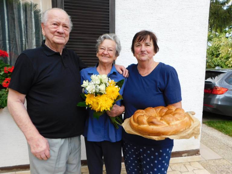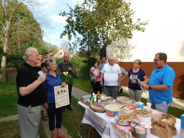 Ob njunem praznovanju so se zbrali in jima prišli osebno čestitat. Prinesli so jima šopek rož, spominsko listino in po stari prekmurski navadi še sveže pečen vrtanek.
