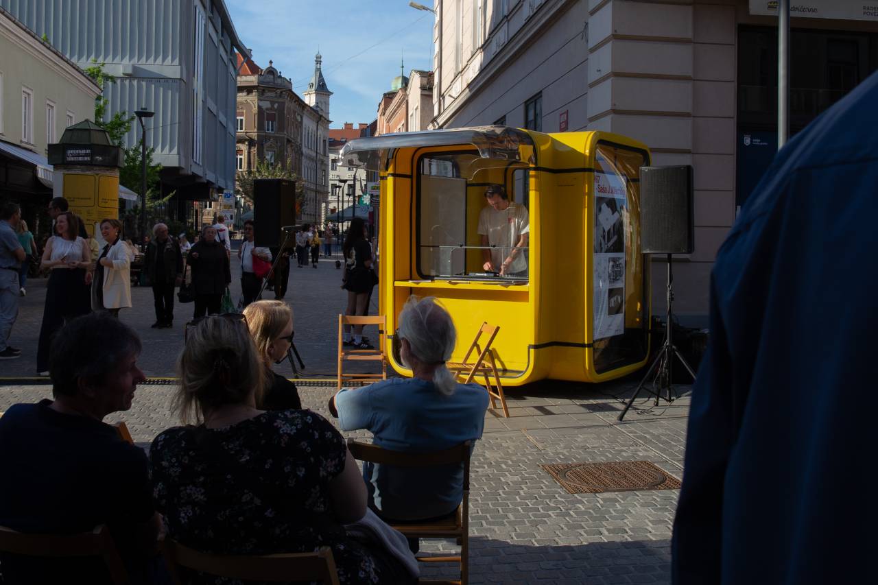Za nagovori je sledil pogovor s Sašo J. Mächtigom, ki je podrobno opisal zgodovino kioskov in kako jih je zasnoval.