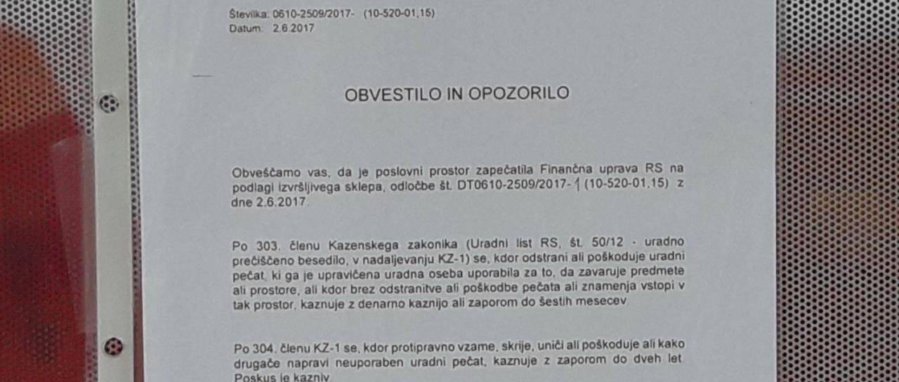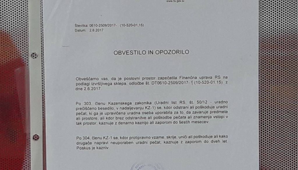 Opazili smo, da je danes v opoldanskih urah s parkirišča ob slaščičarni speljalo vozilo slovenske Carine, sama slaščičarna pa je trenutno opremljena tudi z obvestilom Finančnega urada Murska Sobota, na katerem je zapisano, da je bil poslovni prostor zapečaten.
