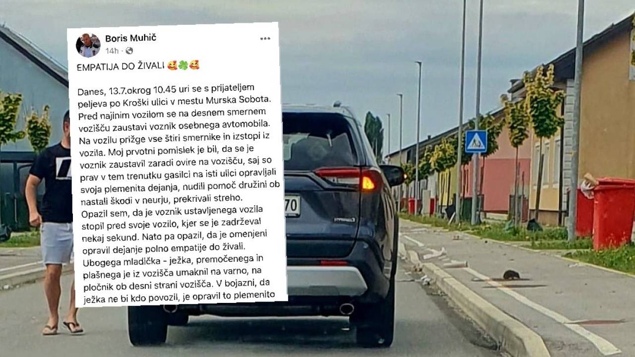 Na cesti se je znašla nebogljena žival, premočen jež, moški v vozilu pred njegovim, pa se je v skrbi za varnost uboge živalci ustavil in ga spravil na varno: