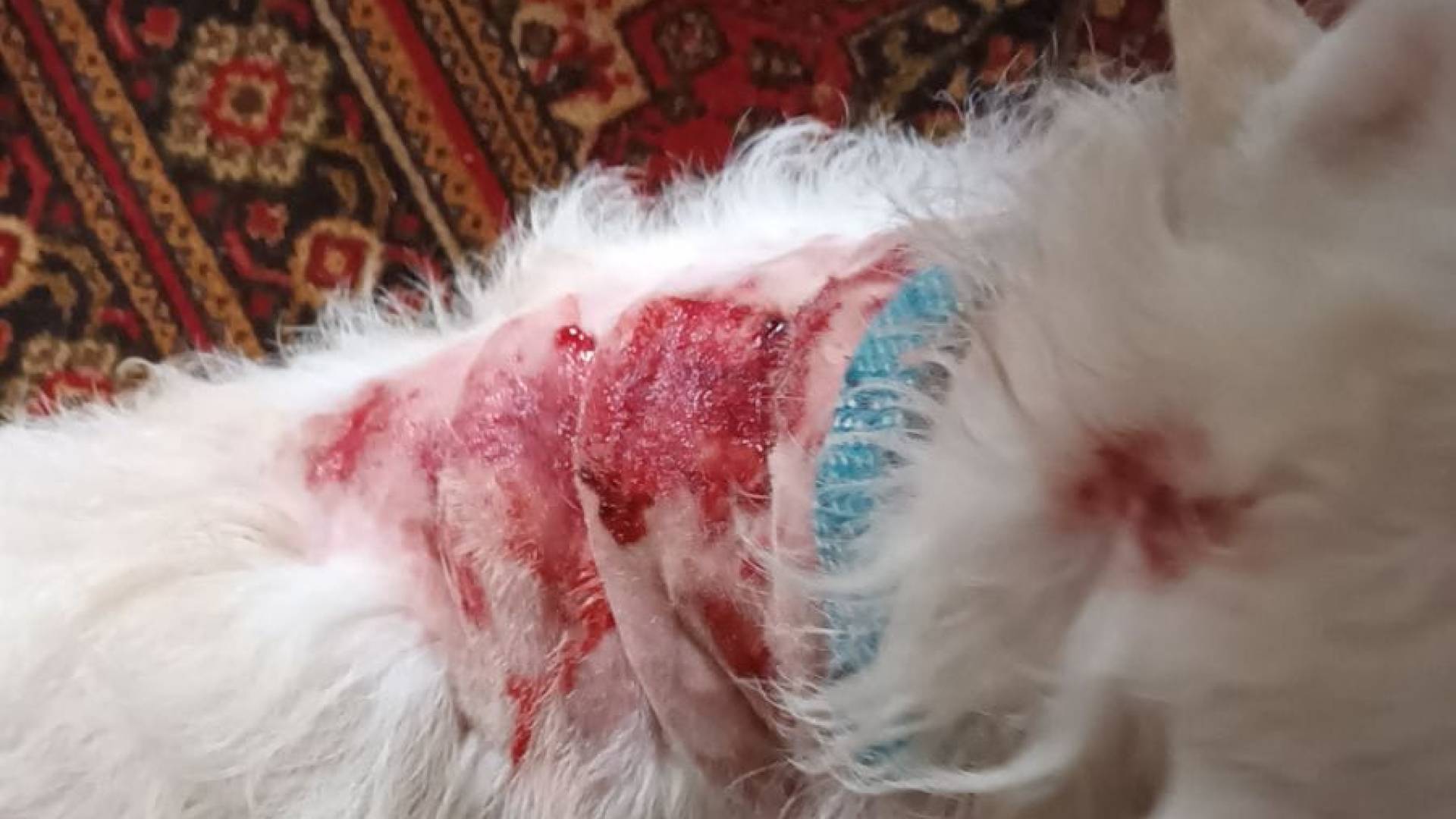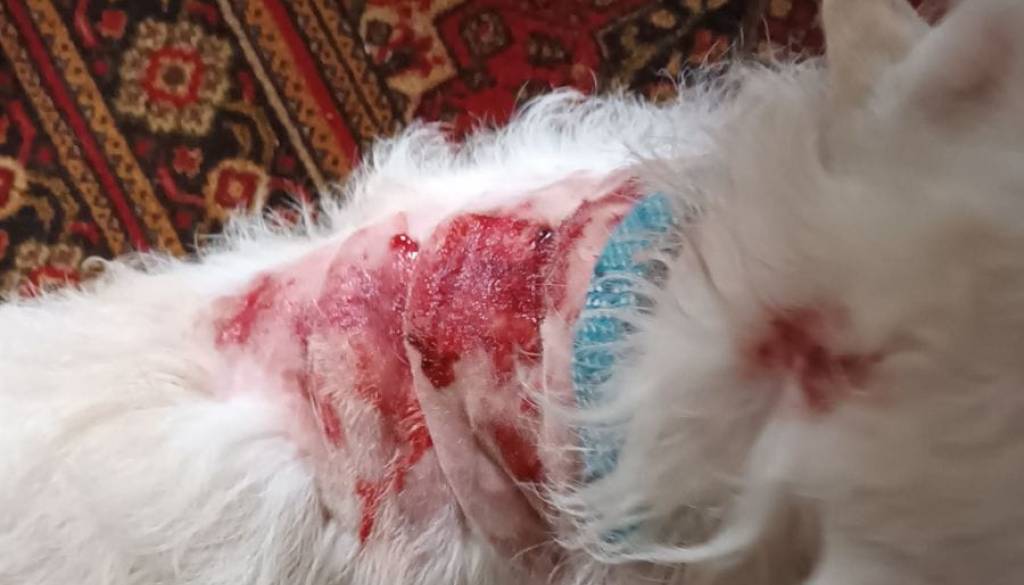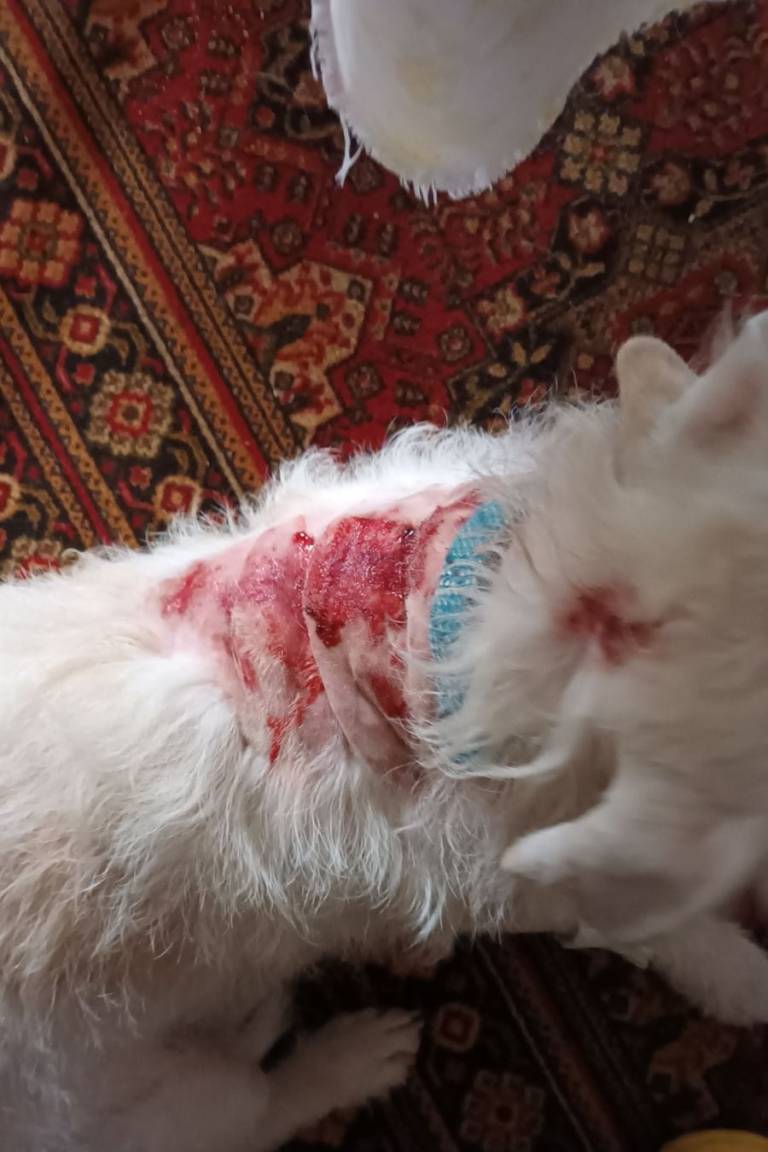 Kot ja zapisala, so na dvorišču našli izbruhana dva sveža kosa mesa in kare s kostjo. Psički so se po telesu začele pojavljati bulice, ki se odpirajo in krvavijo.