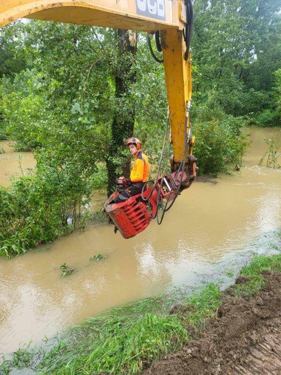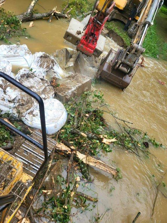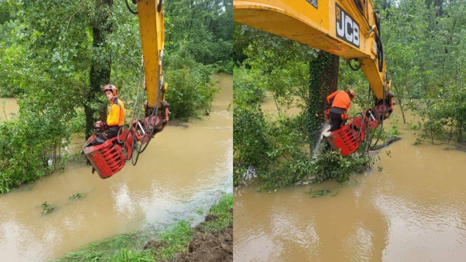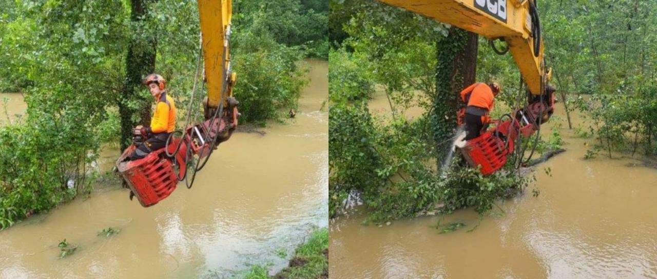 Gozdar je s pomočjo večjega gradbenega stroja ICB najprej z motorno žago prežagal dva velika topola, ki sta padla na pretrgani nasip in s tem ustvarili oviro.