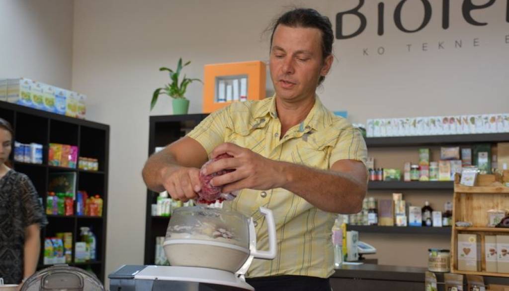 V murskosoboški trgovini z ekološko pridelano hrano Bioteka so včeraj pripravili delavnico izdelave zdravih sladoledov. Kako pripraviti okusen domač sladoled je udeleženke učil Matjaž Kološa, živilski tehnolog z dobrimi dvajset leti izkušenj v pripravi zdravih jedi. Poskusili so veganske, presne in mlečne sladolede z okusi ribeza, ananasa, jagod, malin in čokolade.