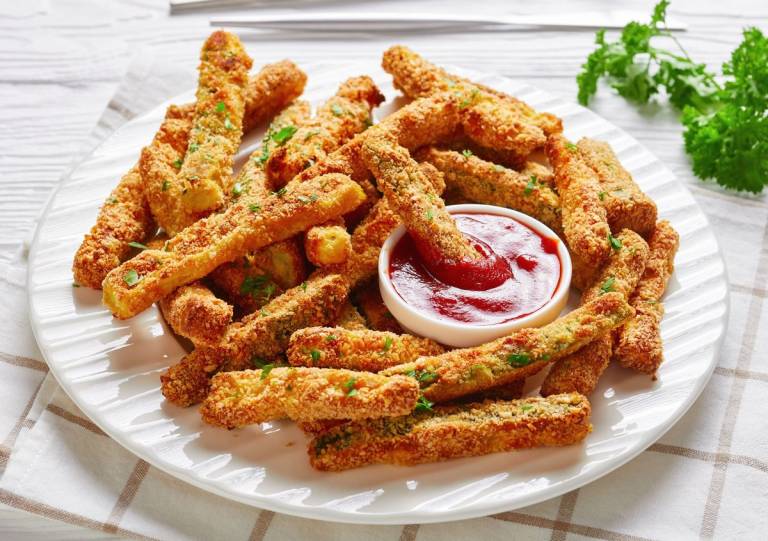 Pri tem zanimivem receptu bučke najprej operemo in olupimo, nato pa jih narežemo na palčke in jih nekoliko osušimo. Potrebujemo tri globoke krožnike, v katerih bomo palčke nato panirali.