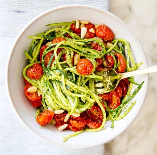 Bučkini špageti s pestom in češnjevimi paradižniki